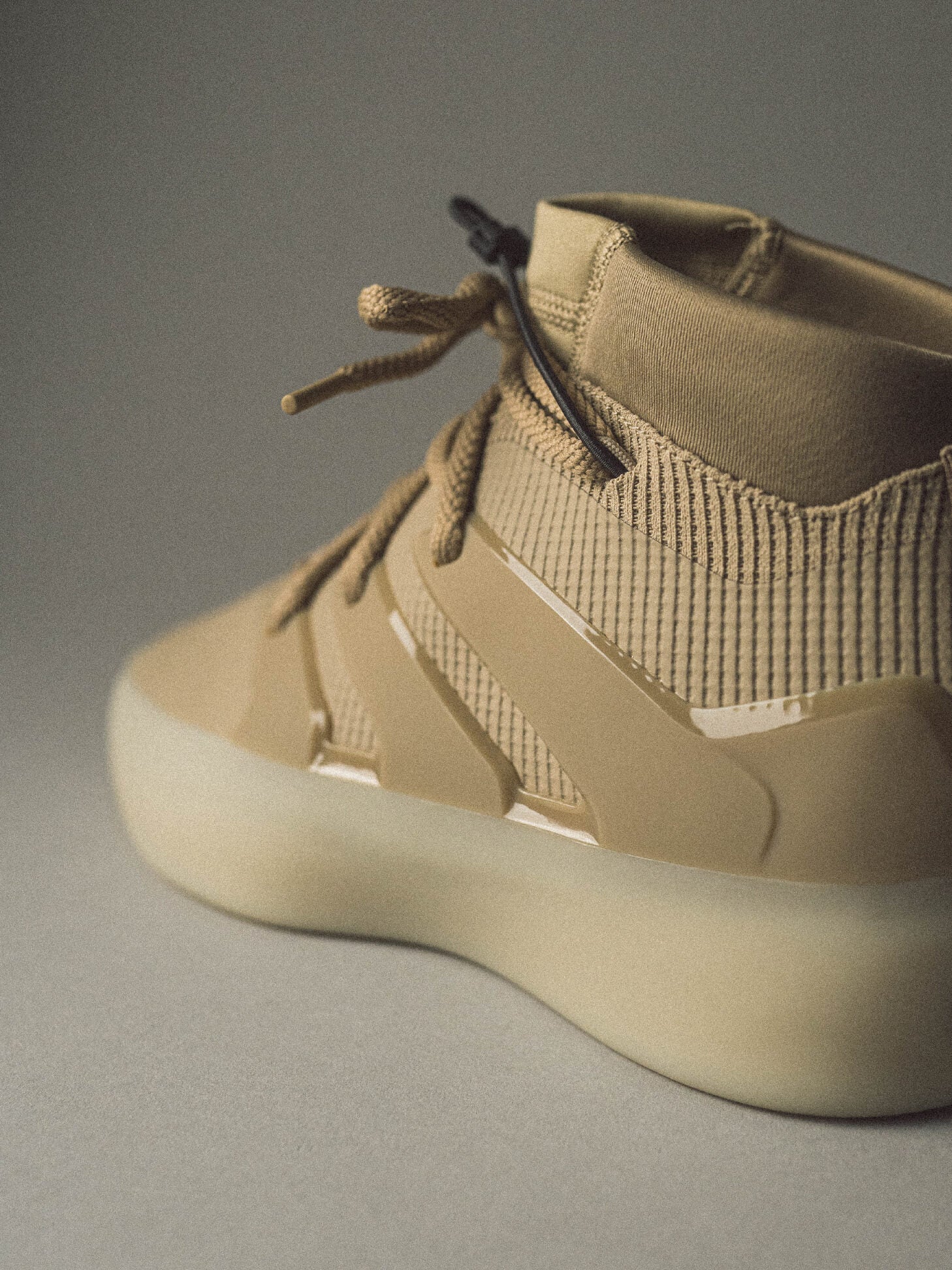 El estilo de esta silueta adidas Fear Of God athletics l Basketball, comienza su icónico y particular diseño en una base superior de alto estándar con un tejido de primera calidad en neopreno de colorway neutral y monocromático como el “Clay”.