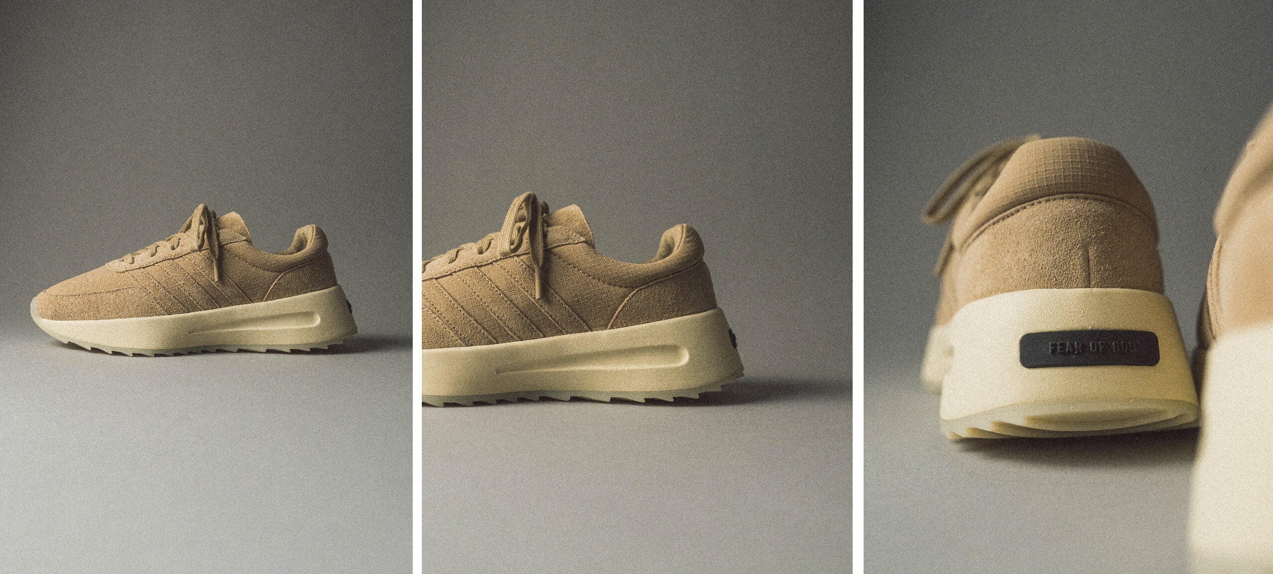 Continúa su estética de perfil bajo con un elástico en el tobillo, superposiciones de película de TPU sin costuras en la misma tonalidad, el logo de adidas grabado en la puntera y una barra negra grabada con el logo de Fear of God en el talón.