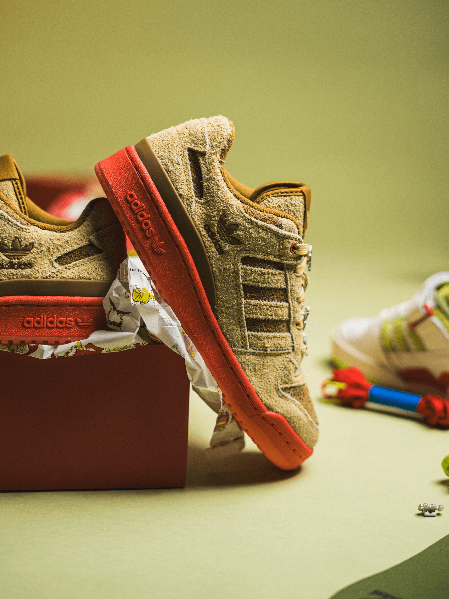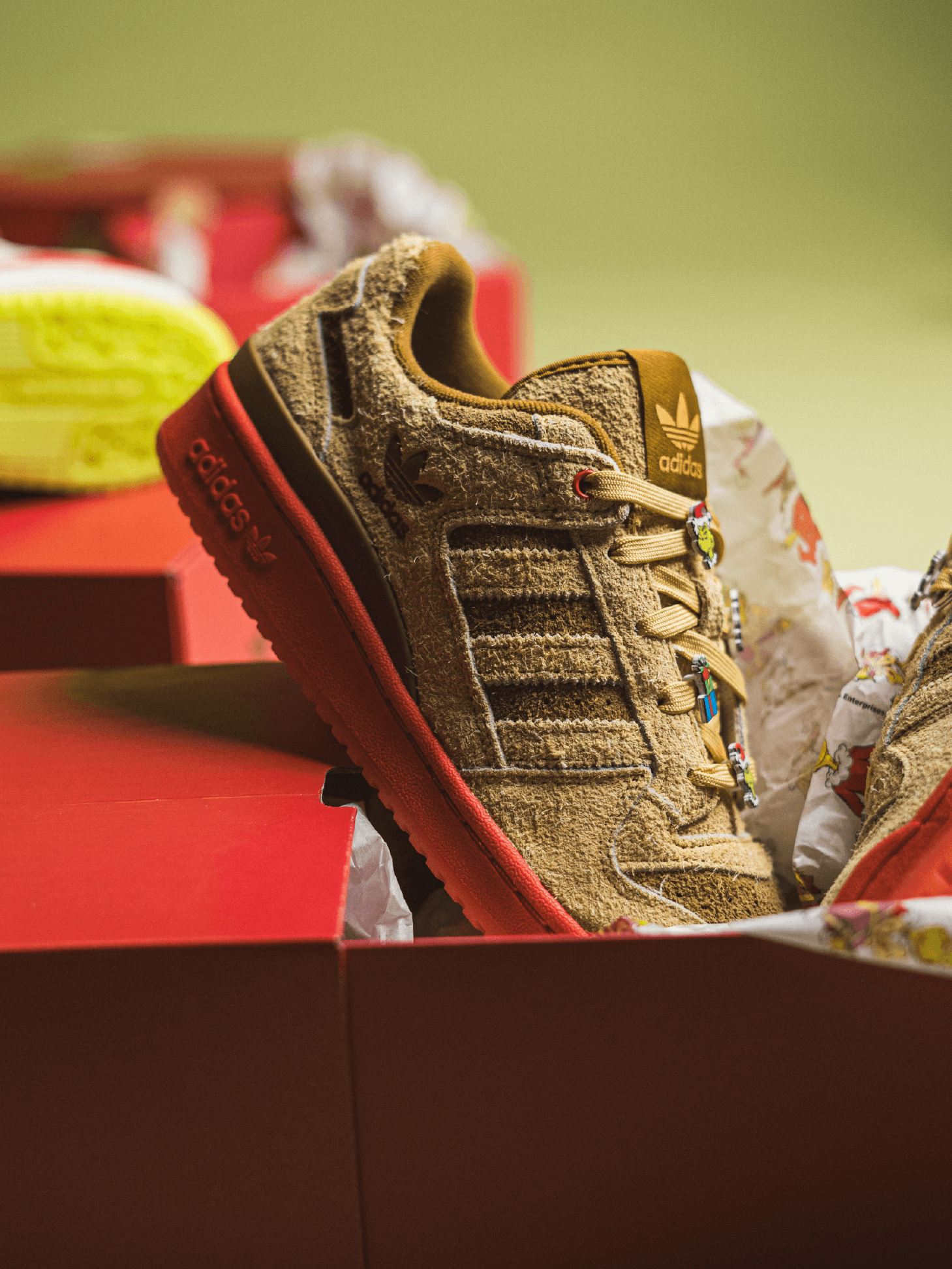 La versatilidad de la silueta adidas Forum Low fue la base perfecta para plasmar las ocurrencias y travesuras de los personajes de esta película. Las tres propuestas planteadas para este lanzamiento se dividen en colores y diseños totalmente distintos, pero complementarios. Comenzando en una versión en color rosa claro de Cindy Lou, una segunda versión en tonos crema, representando al fiel perro Max y finalmente su personaje principal The Grinch.