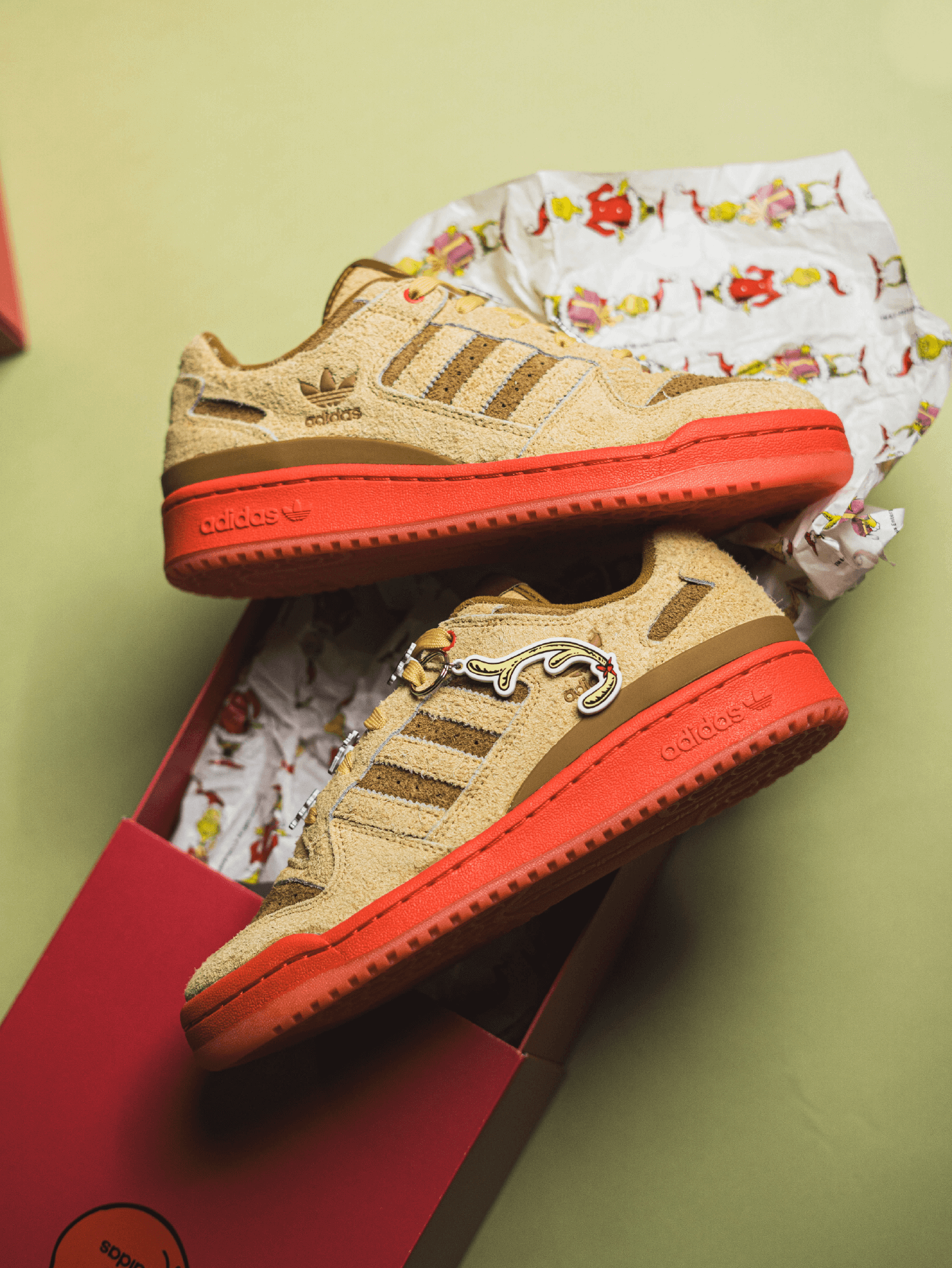 Completando esta colección de Forum Low, llega un diseño con la esencia de ese compañero fiel del Grinch, su perro Max. Este estilo presenta una parte superior marrón de gamuza premium que hace referencia a su color de pelaje de dos tonos y finaliza con una suela roja brillante de su auténtico collar que contrasta a la perfección.