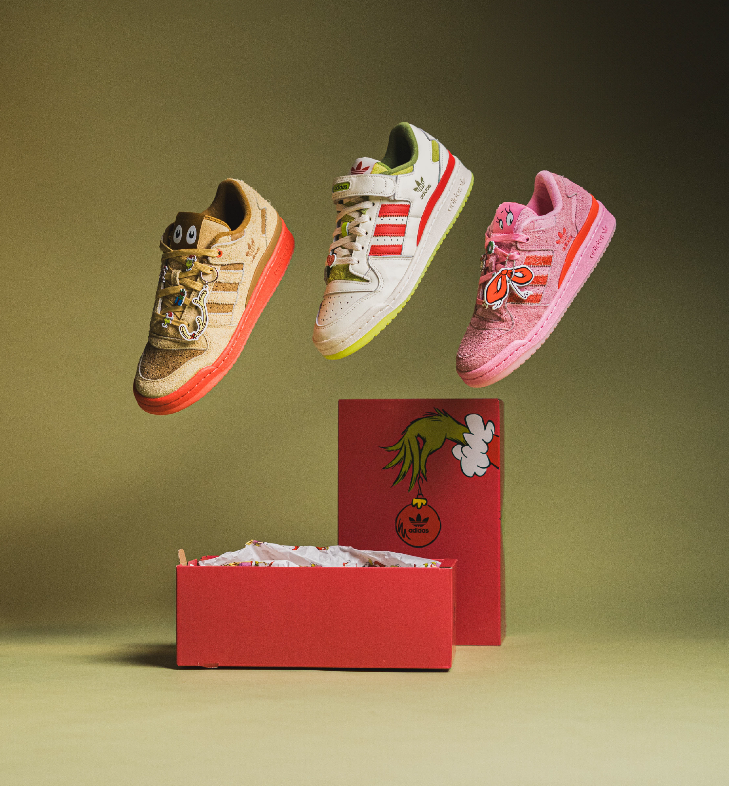 Estos estilos presenta detalles en gamuza, que rinden homenaje a Cindy-Lou Who y Max, personajes clave de la historia de The Grinch y asimismo, el logo de adidas está presente en las tres siluetas.