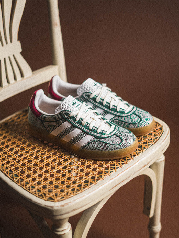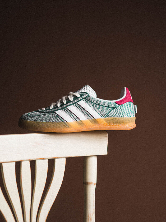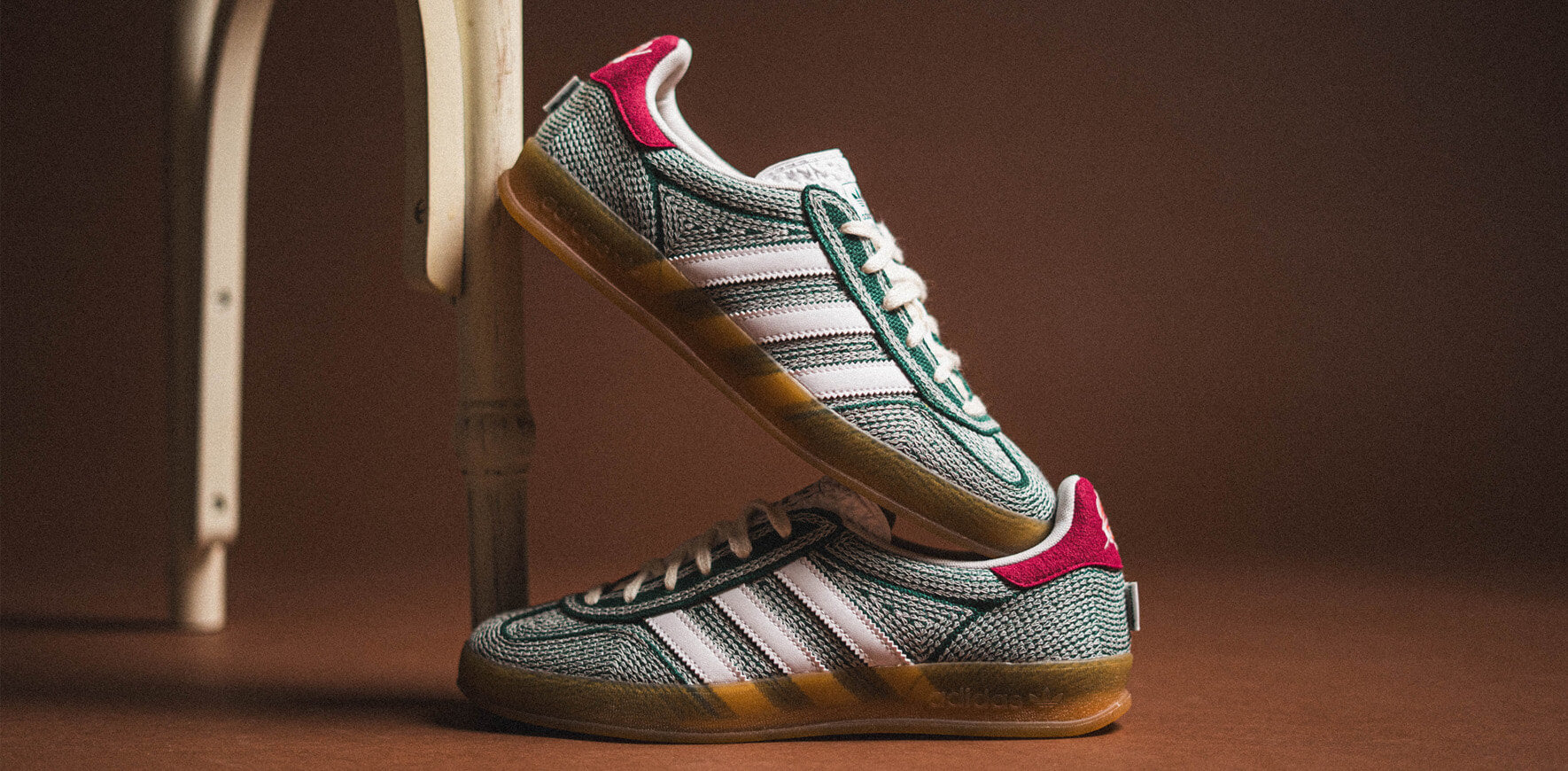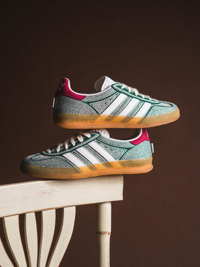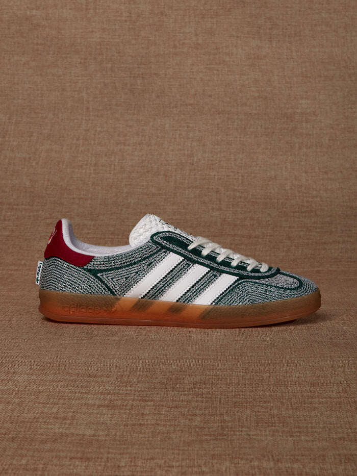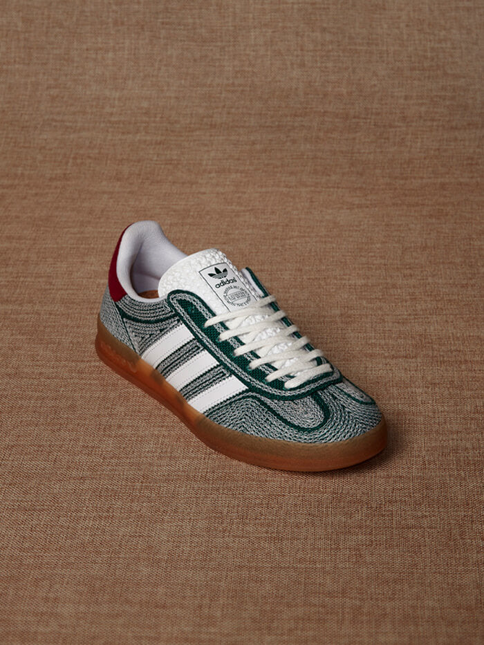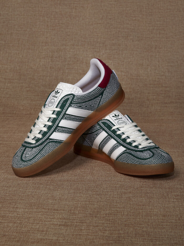 Esta nueva versión ecológica de las adidas Gazelle Indoor están confeccionadas en efecto con piel Mylo, un cuero que proviene del micelio (las raíces de los hongos) y que se combina en colores verdes y blancos hechos de cáñamo, logrando una apariencia distinta de la típica construcción de gamuza de las Gazelle.