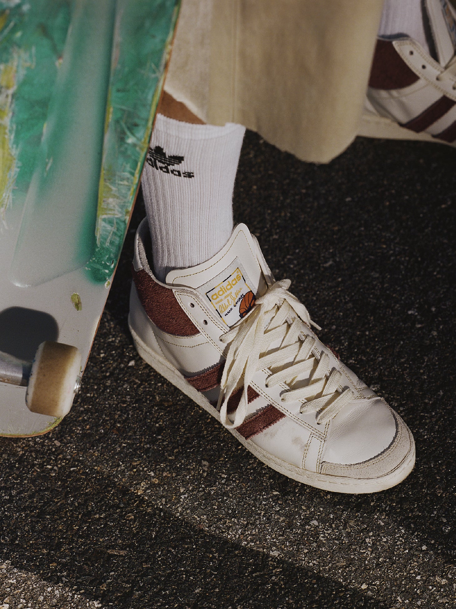Una suela ligeramente amarillenta y cordones color crema completan ese look auténticamente vintage, evocando parquet, canchas urbanas y calles con historia.