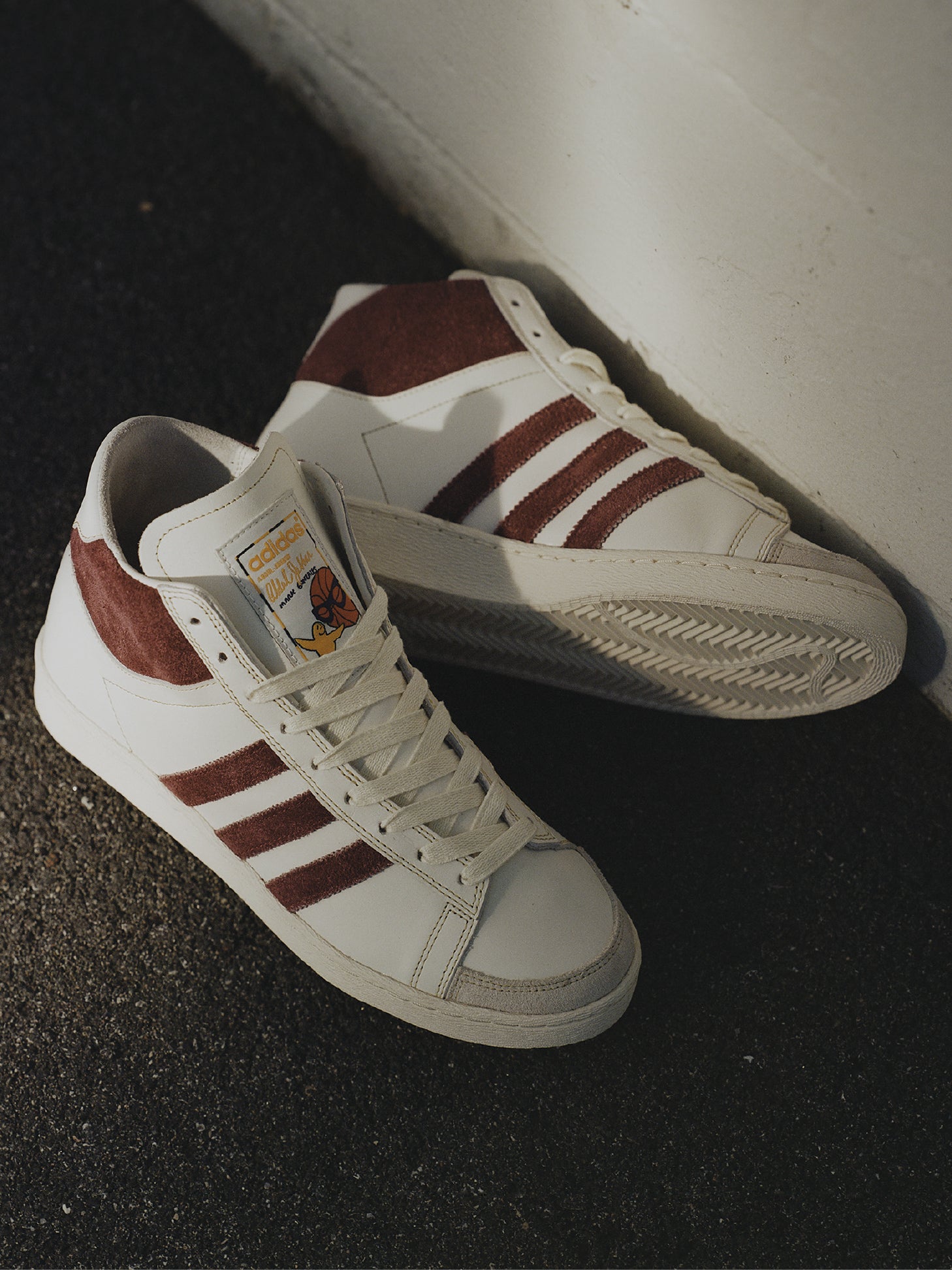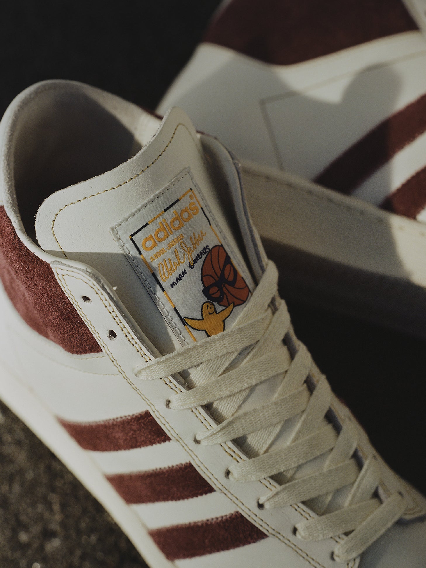 La versión de Mark Gonzales del Jabbar Hi se viste con un cuero liso de alta calidad en tono 'Chalk White', que evoca la elegancia retro de las siluetas clásicas de básquet. Sobre esa base, contrastan detalles en gamuza texturizada 'Shadow Red en las tres franjas y el cuello de tobillo — un guiño a la estética de los 70s y 80s, cuando el modelo original empezó su legado.
