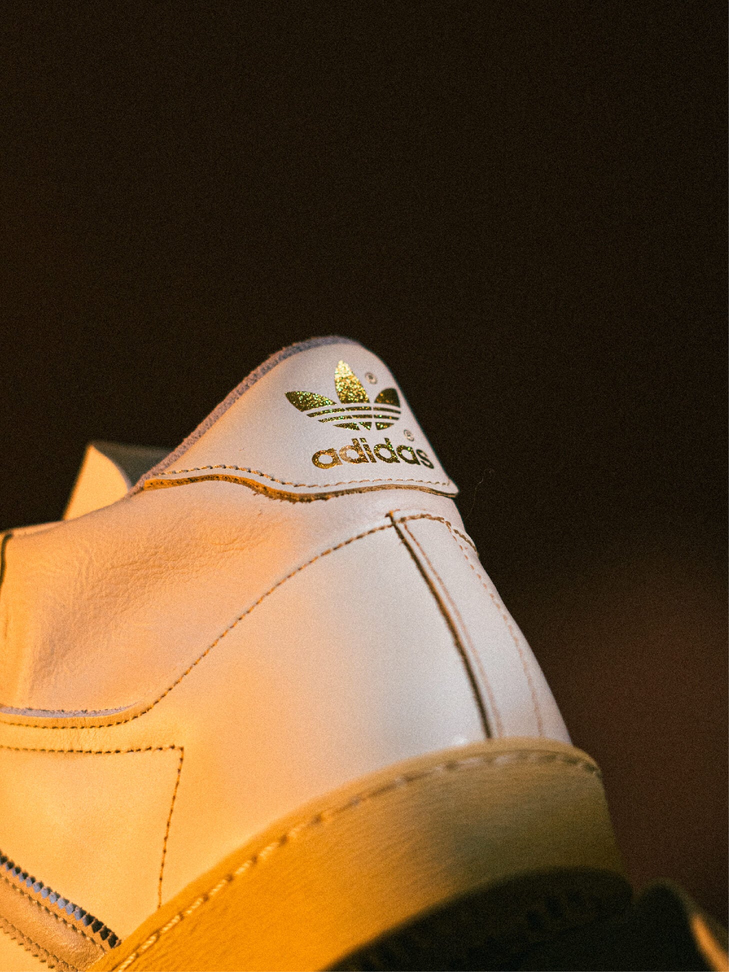 El modelo destaca por su fabricación en cuero premium, que le otorga una apariencia sofisticada y asegura su durabilidad. La puntera de gamuza, además de aportar textura, refuerza el diseño y añade un toque distintivo al conjunto. El logotipo de las tres rayas de Adidas, junto con la firma "KAREEM" en el costado, conecta directamente con la historia y su vínculo con el legendario jugador.