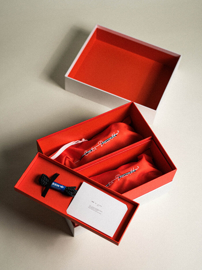 Las zapatillas tienen una ventaja gracias a la obra de arte moteada contemporánea diseñada por Dewitt y que se muestra en la pared lateral de la entresuela y la parte superior Primeknit. Para demostrar aún más su contribución a este esfuerzo conjunto, el autógrafo de Dewitt está tallado en la plantilla de la zapatilla.