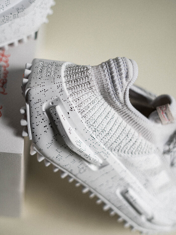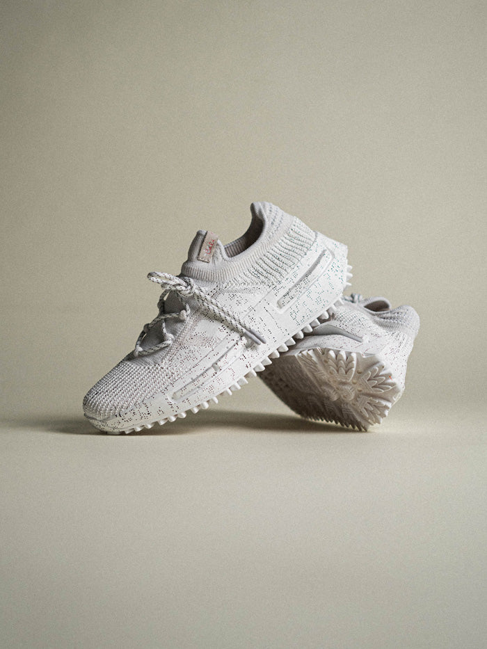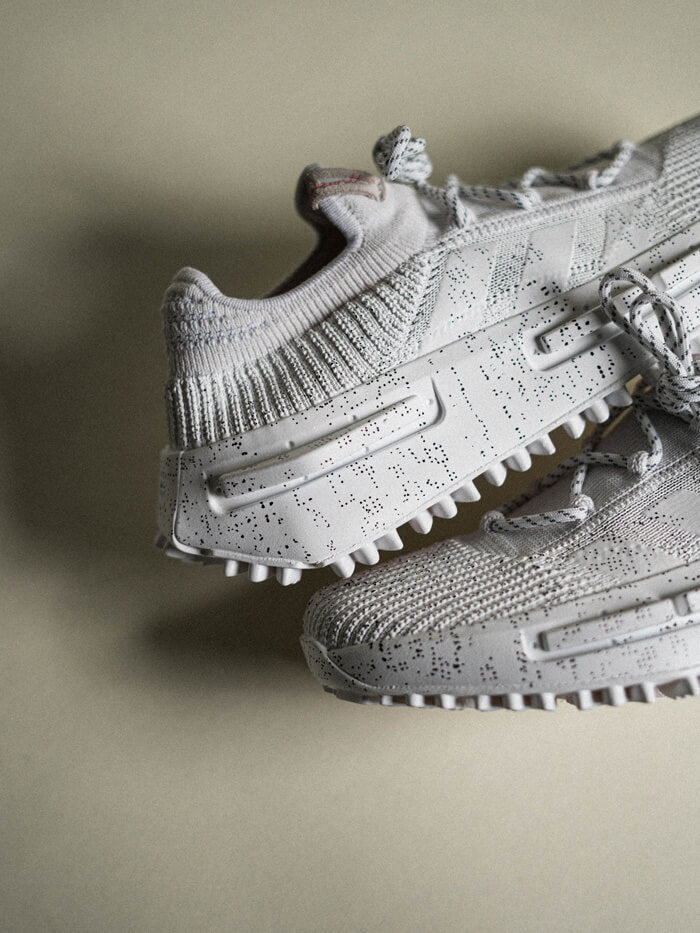 El zapato NMD S1 de color blanco con sus suelas monocromáticas, y su cuello de color gris, junto con los sistemas de cordones son puntos clave de contraste.