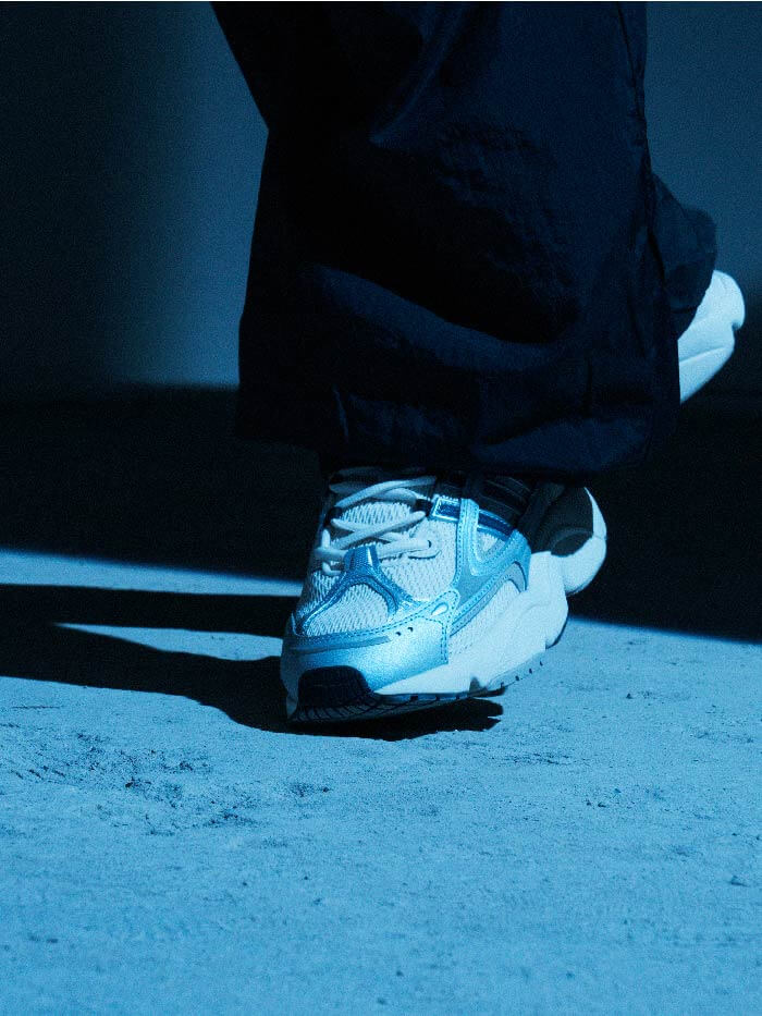 Asimismo, el contraste de este modelo llega en un colorway "Chalk White" que cuenta con una distintiva puntera de goma y lengüeta elaborada en malla con un estilo futurista también metalizado en plateado y cuero sintético en beige como toque de elegancia y estilo.