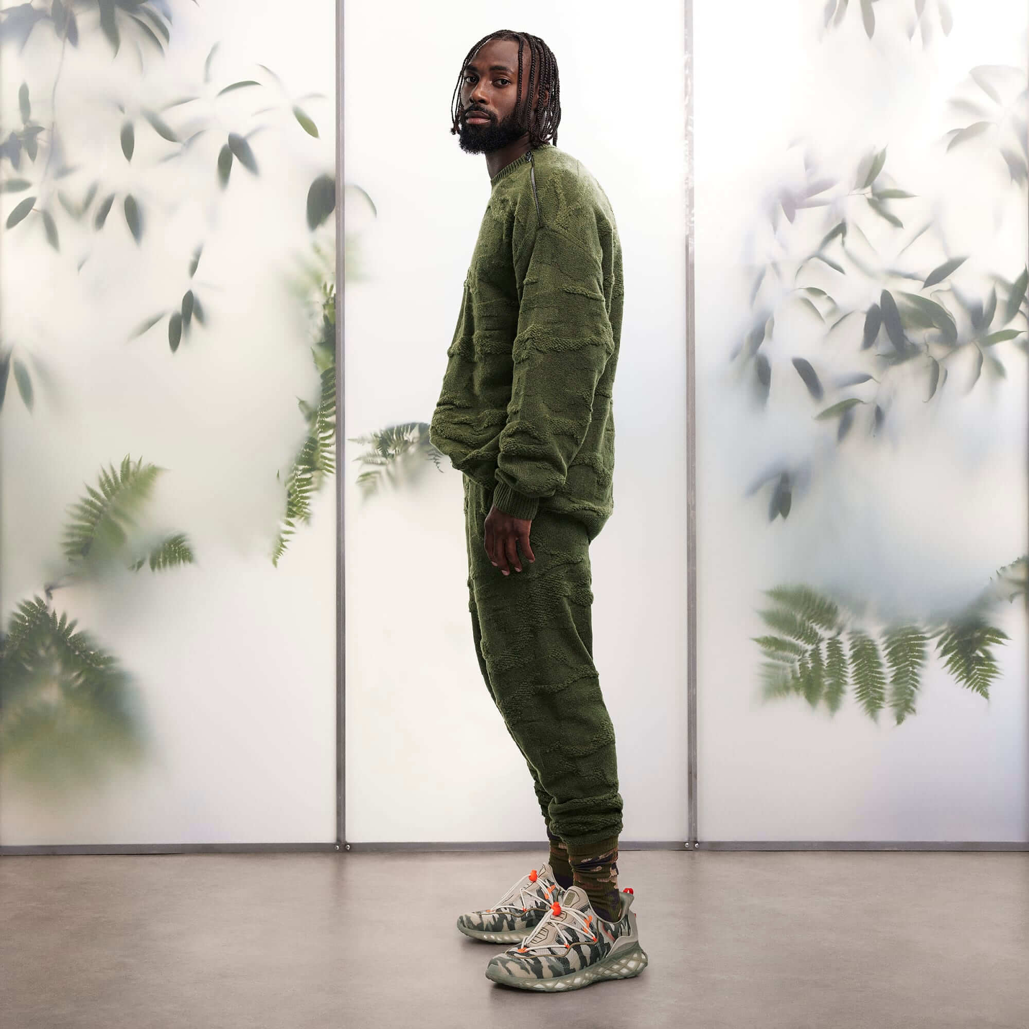 Adentrándonos en las prendas de vestir, encontramos muy marcadas las dos vertientes mencionadas anteriormente, una mezcla de diferentes patrones de camuflaje en verdes no convencionales, tanto en pants como en crop tees y desarrollos mas futuristas en sus hoodies, crewnecks y jerseys de lujo que acompañan todo este drop, sin dejar atrás unas de las piezas mas relevantes de los collabs de adidas e Ivy; Los sneakers.