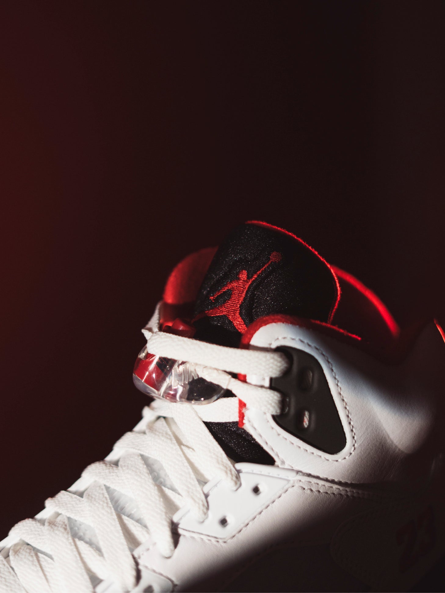 La Air Jordan 5 fue el primer modelo de basketball en incorporar una lengüeta reflectante (3M), pensada para resaltar bajo los flashes de las cámaras. La anécdota cuenta que en algunas ligas menores se llegó a desaconsejar su uso porque el brillo podía distraer a los rivales. Aunque no existió una prohibición oficial en la NBA, esa historia alimentó su mística y reforzó su carácter disruptivo.