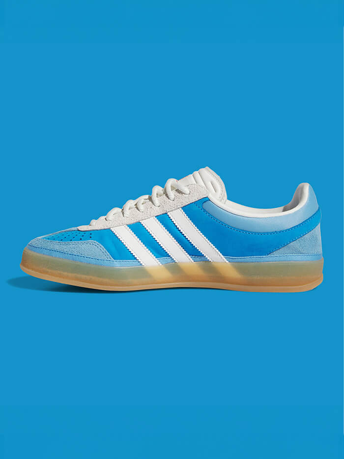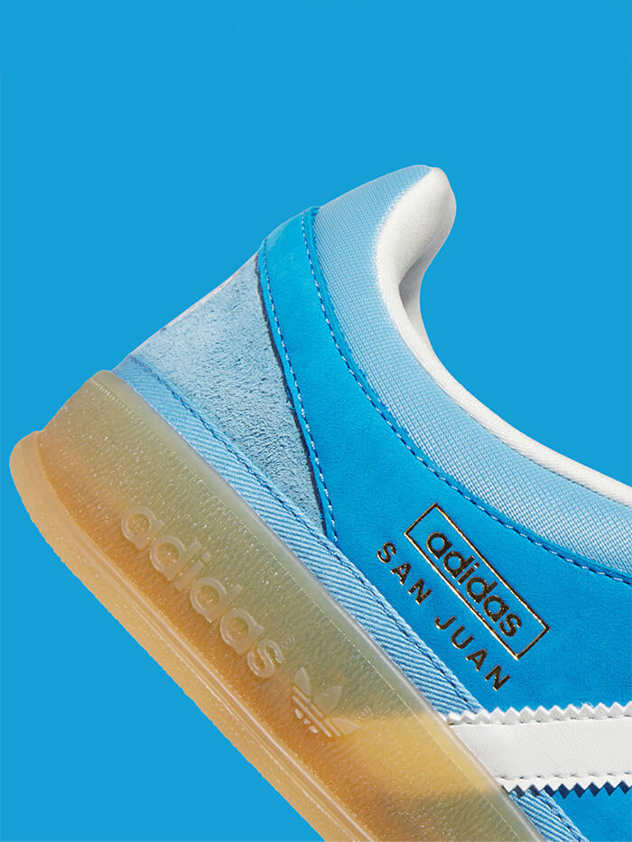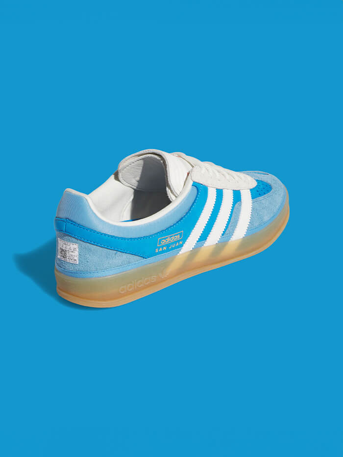 Las adidas Gazelle Indoor San Juan, se distinguen por su acabado en ante y cuero azul, complementadas con detalles en gris y blanco que evocan el espíritu de las playas de esta ciudad.