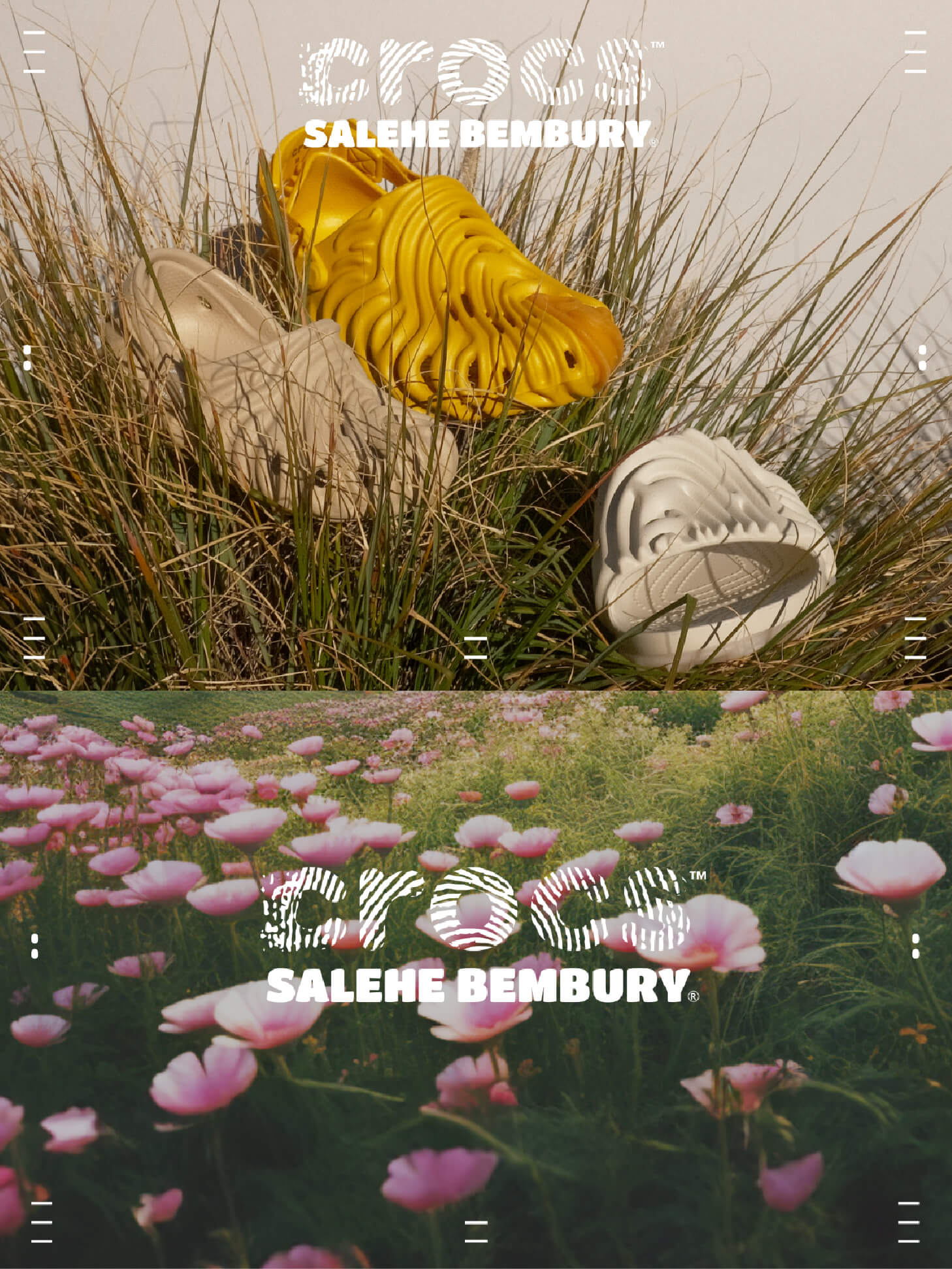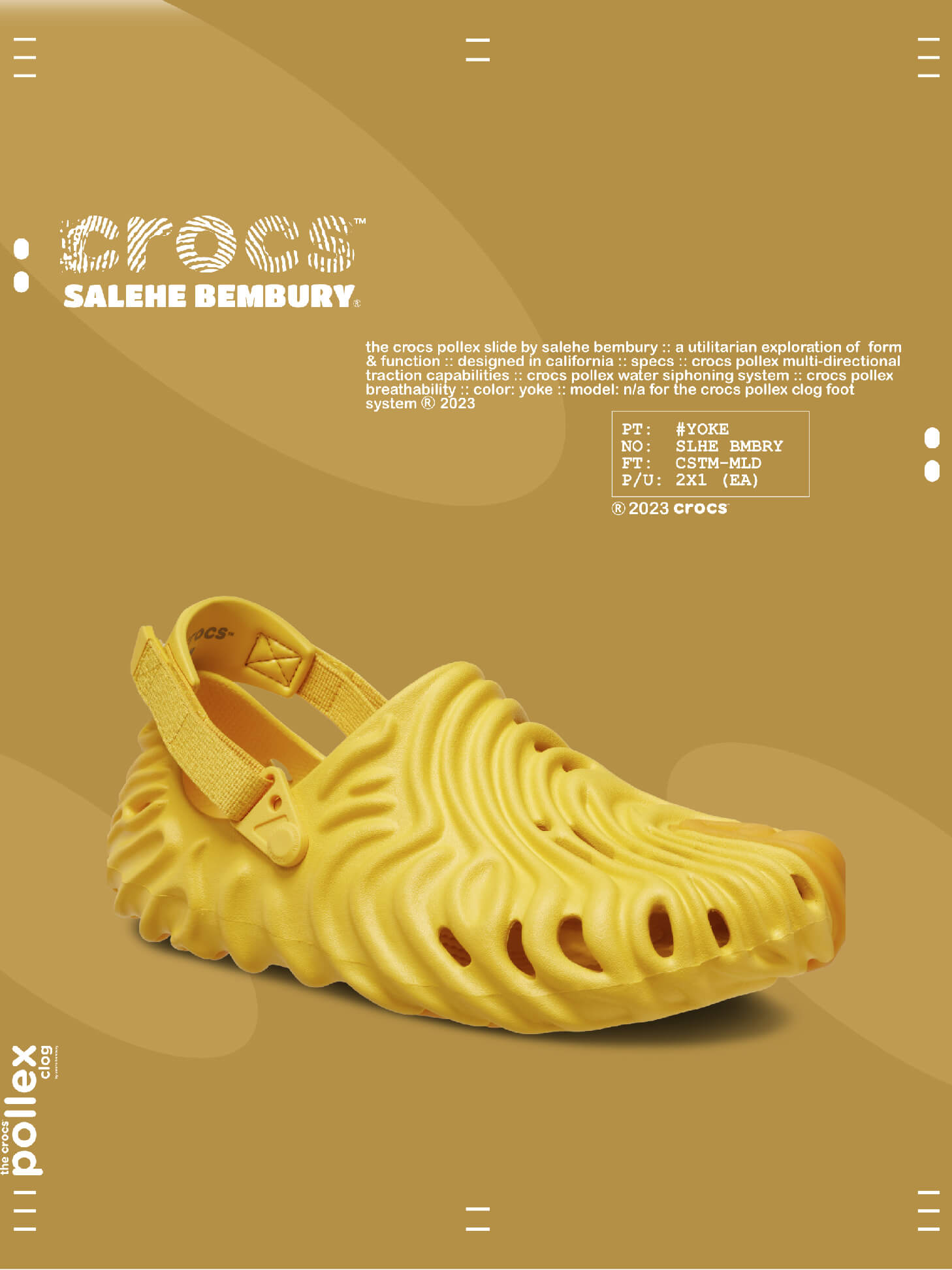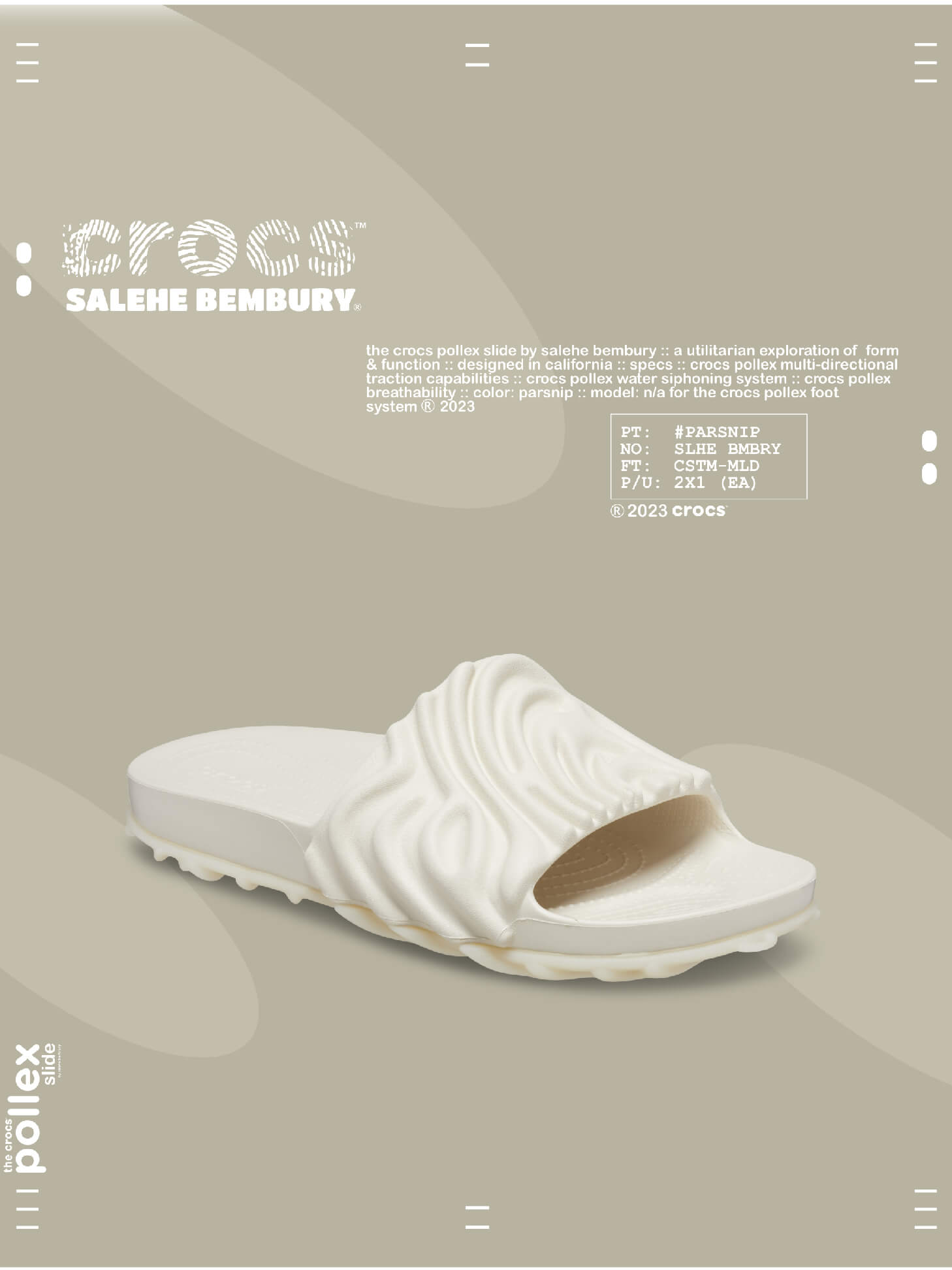 Junto a Crocs, por su parte, ha colaborado desde diciembre de 2021, integrando su diseño icónico que ha posicionado a la marca de una manera progresiva. Este año, Bembury llegó con una nueva entrada para la temporada: “Colorway Salehe Bembury X Crocs Pollex Clog”, en la que explora diferentes gamas de estilos y colores conservando la comodidad y practicidad en su uso.