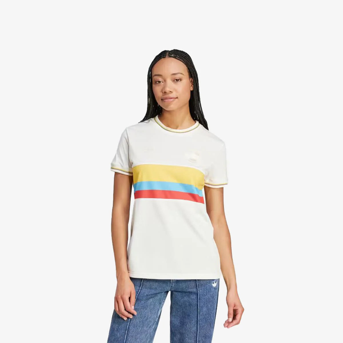 .Minimalismo con estilo retro: la camiseta con los colores de la bandera colombiana es una pieza clave que puedes combinarla con pantalones negros ajustados o una falda simple para crear un look que evoca un aire retro sin perder elegancia. Añade una chaqueta para un toque adicional de autenticidad.