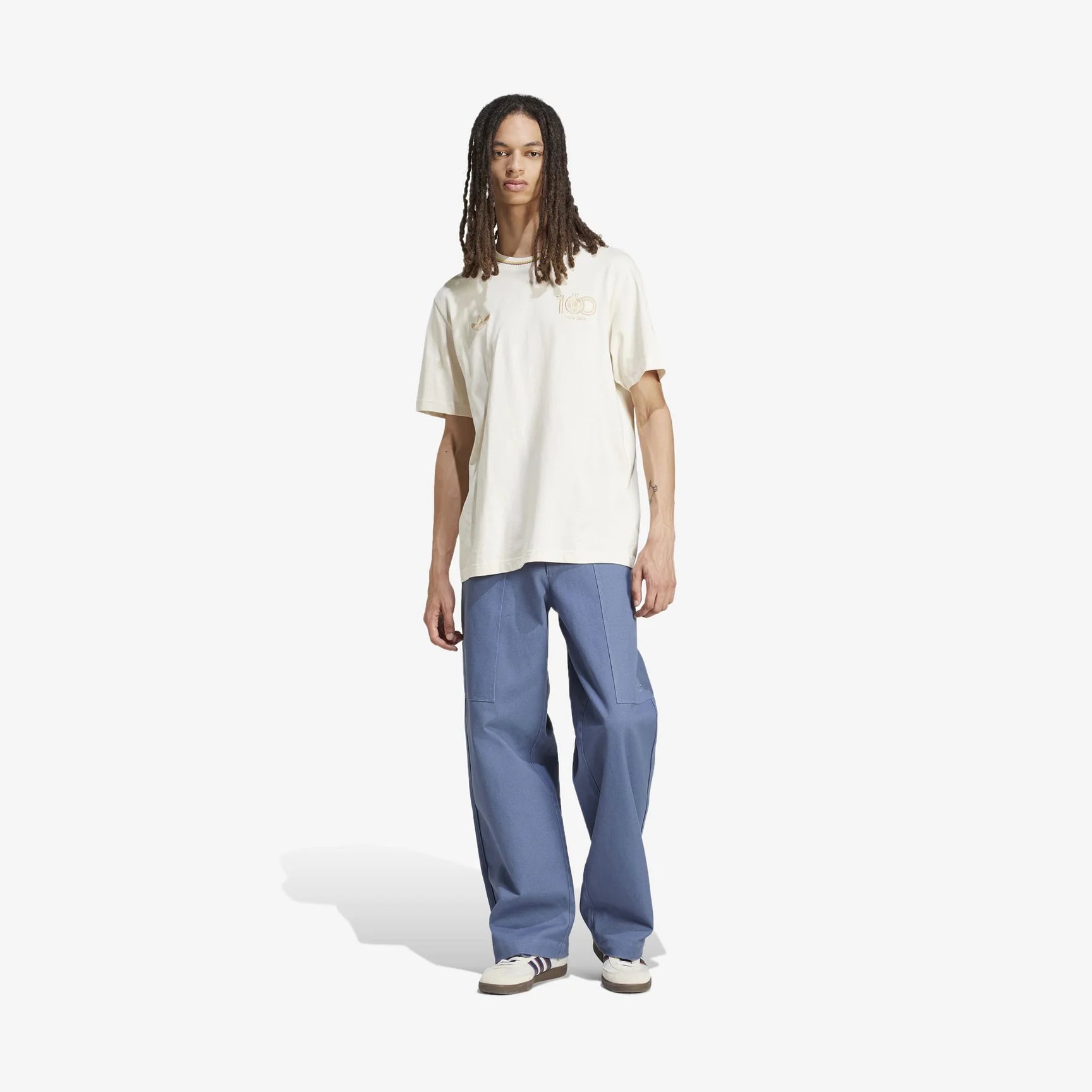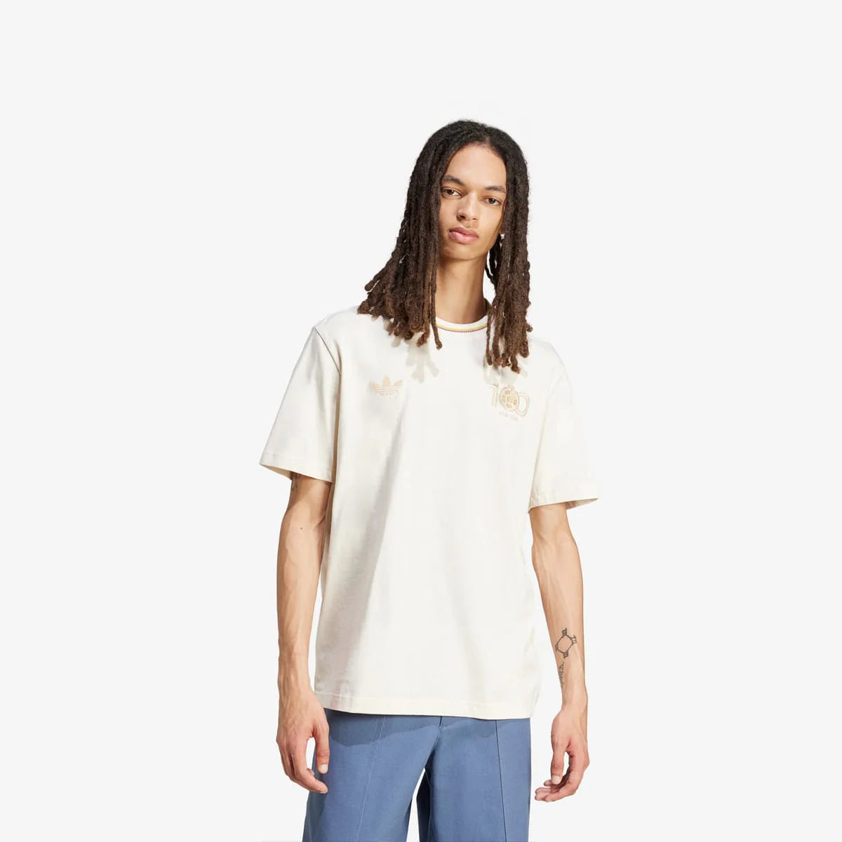 .Look casual con un toque deportivo: combina el jersey principal de la colección con pantalones holgados y unos sneakers clásicos adidas como Samba SL72 o Gazelle. Este look es ideal para salir con amigos o asistir a eventos deportivos.