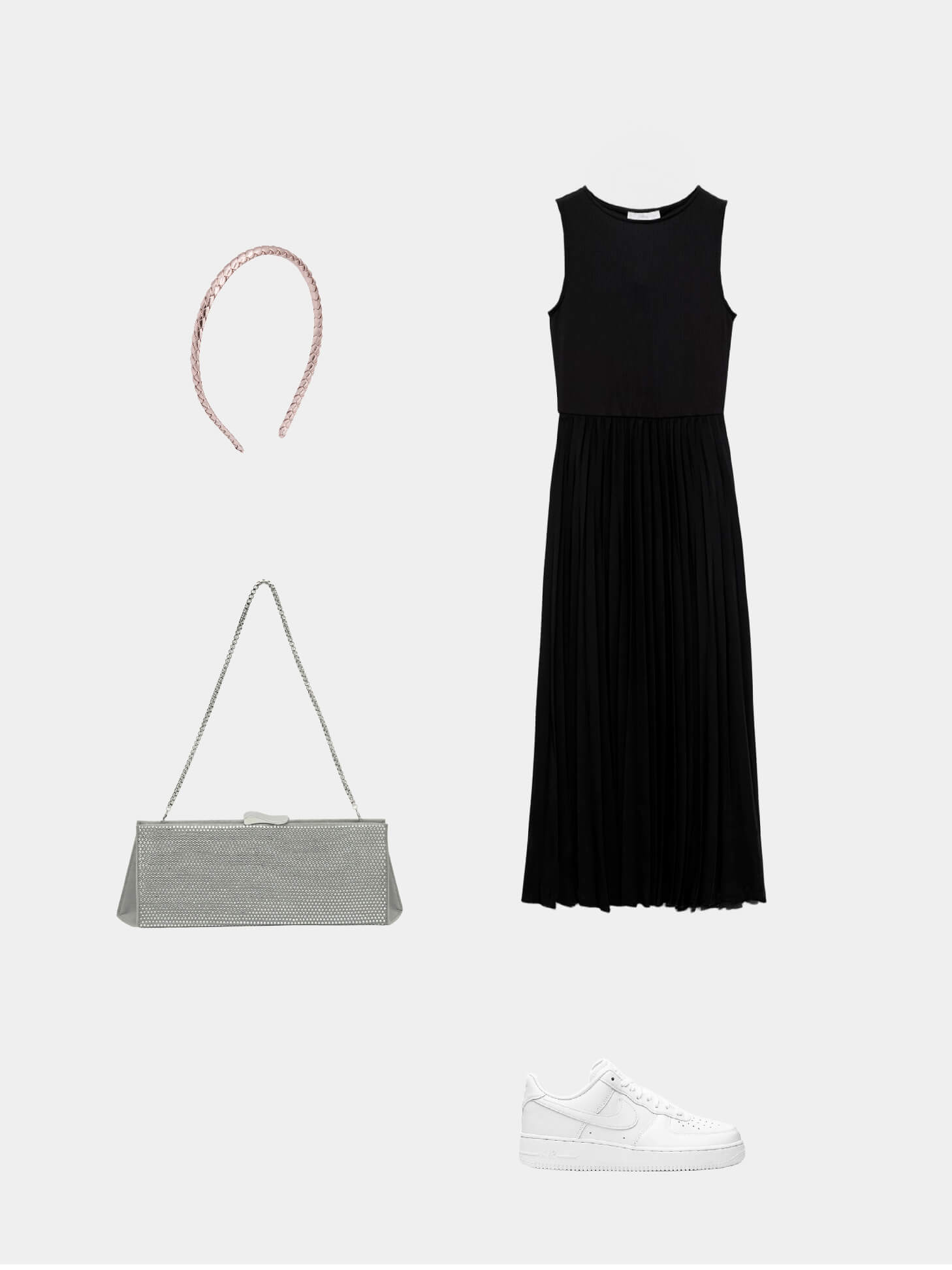 Elegancia Retro: Para un estilo inspirado en los años veinte, elige un vestido midi con detalles brillantes que evoquen la opulencia de la época. Combina esta pieza con las Nike Air Force 1 Low en blanco, añadiendo un contraste moderno al look. Completa el conjunto con una diadema con detalles metálicos y un bolso tipo clutch, ideal para eventos formales o cenas especiale