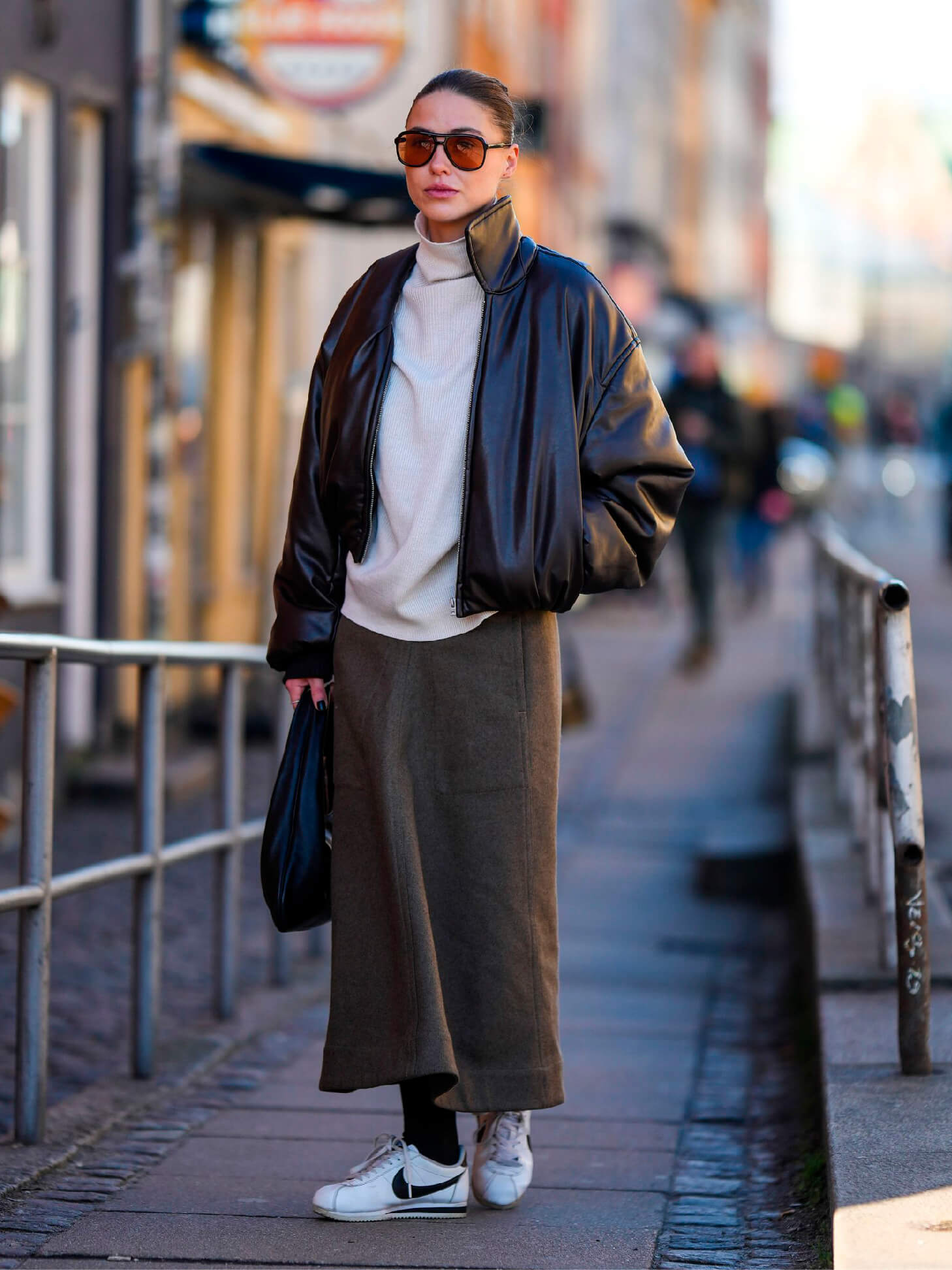 Contemporáneo: Para un estilo cómodo, pero con diseño, combina un suéter oversize gris claro con joggers beige y una chaqueta acolchada ligera. Añade los Nike Air Max 90 en blanco y gris para un toque moderno, y complementa con un gorro de punto y una bufanda en tonos tierra.