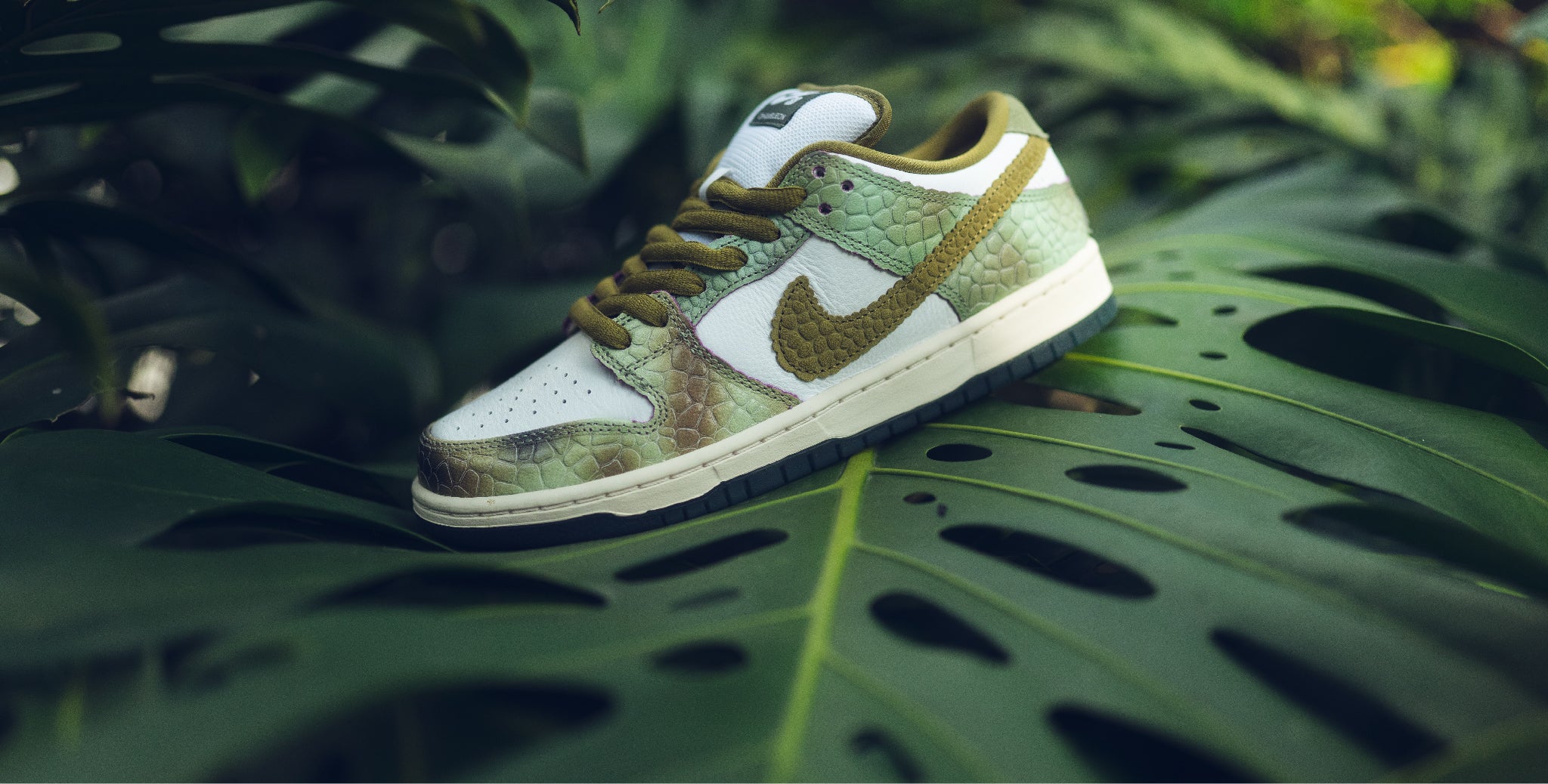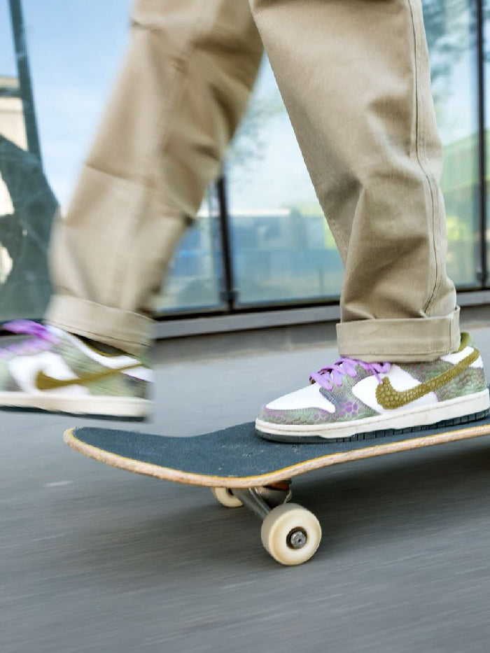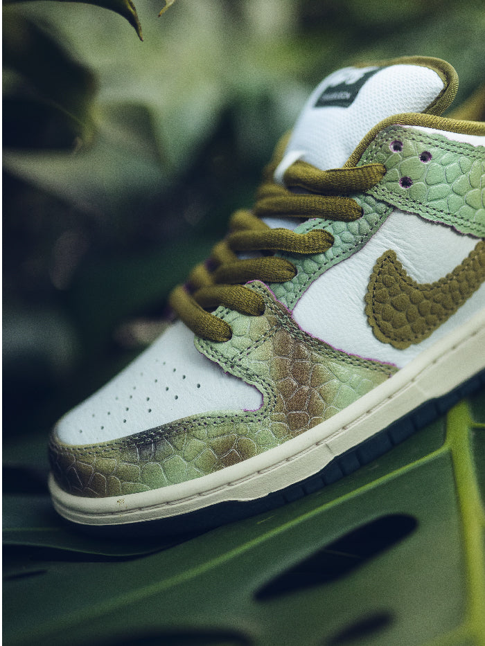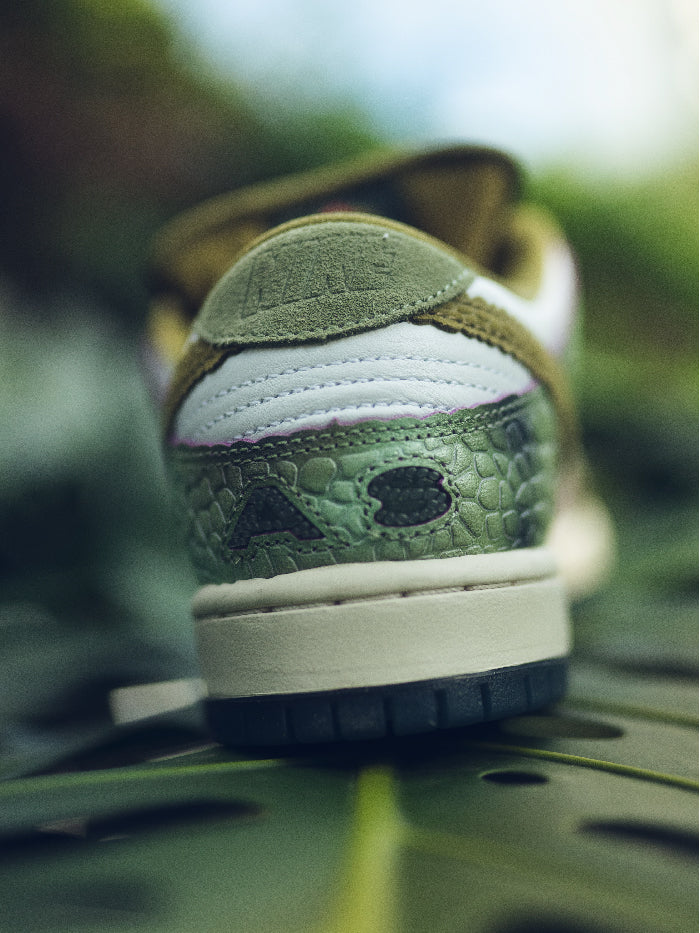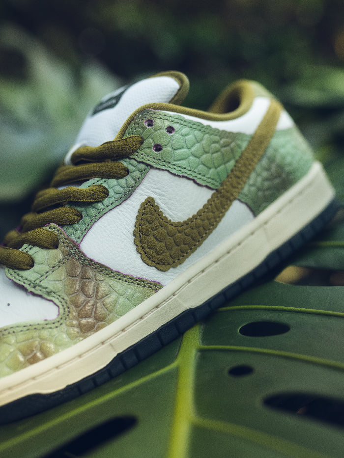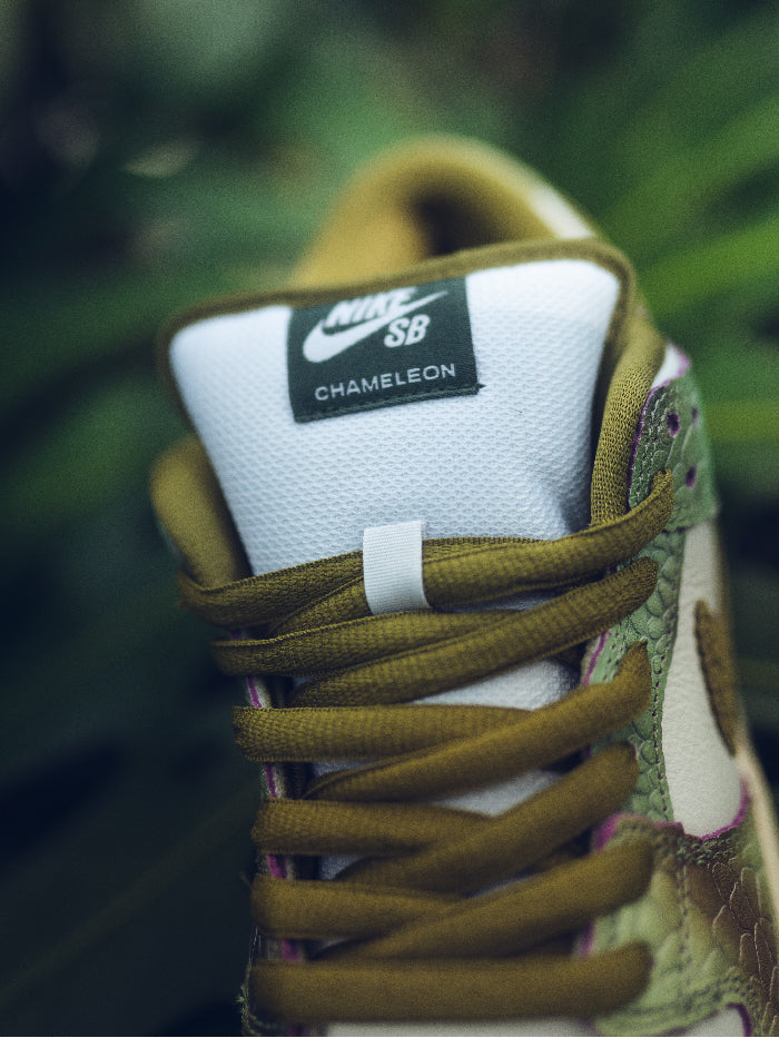 El diseño de esta colaboración se distingue por su originalidad y atención al detalle. Inspirada en la habilidad de los camaleones para cambiar de color, la zapatilla presenta paneles que transforman su apariencia con el tiempo, reflejando la naturaleza adaptativa del skateboarding. Los tonos de verde, musgo y blanco, junto con las texturas de escamas, aportan un estilo único que evoluciona con cada uso.