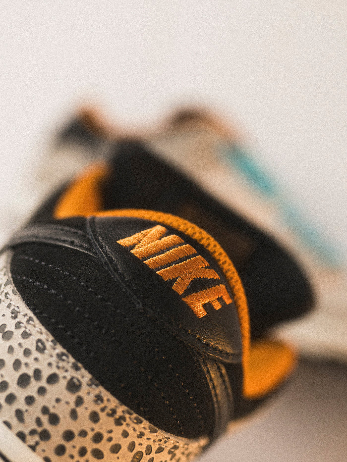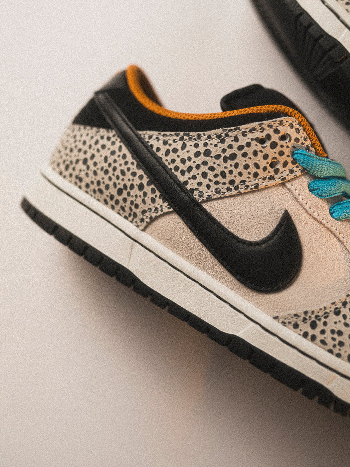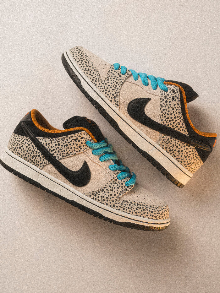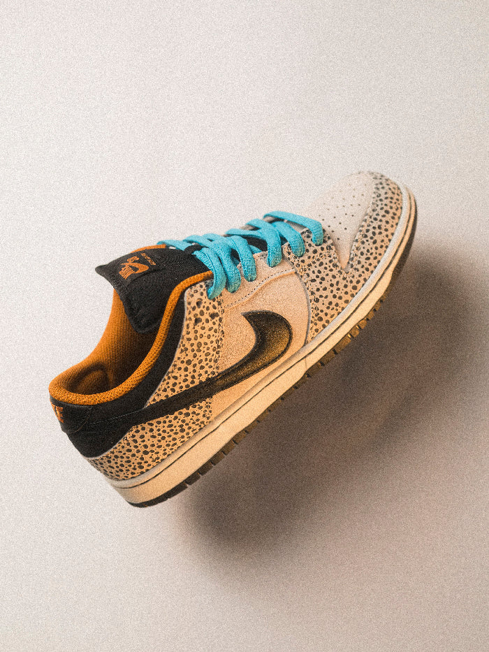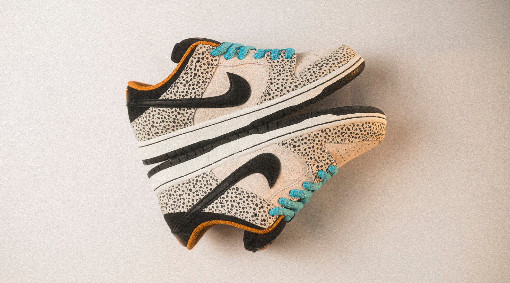 Los Nike SB Dunk Low "Olympic Safari" se unen a los SB Dunk Blazer Mid en su propuesta estética a través de un concepto centrado en las icónicas Air Safari, creadas por Tinker Hatfield. Su patrón de puntos característico aparece en la puntera y en la capa superpuesta del talón, mientras que los colores claros, oscuros e intermedios reflejan la combinación de colores del modelo de 1987.