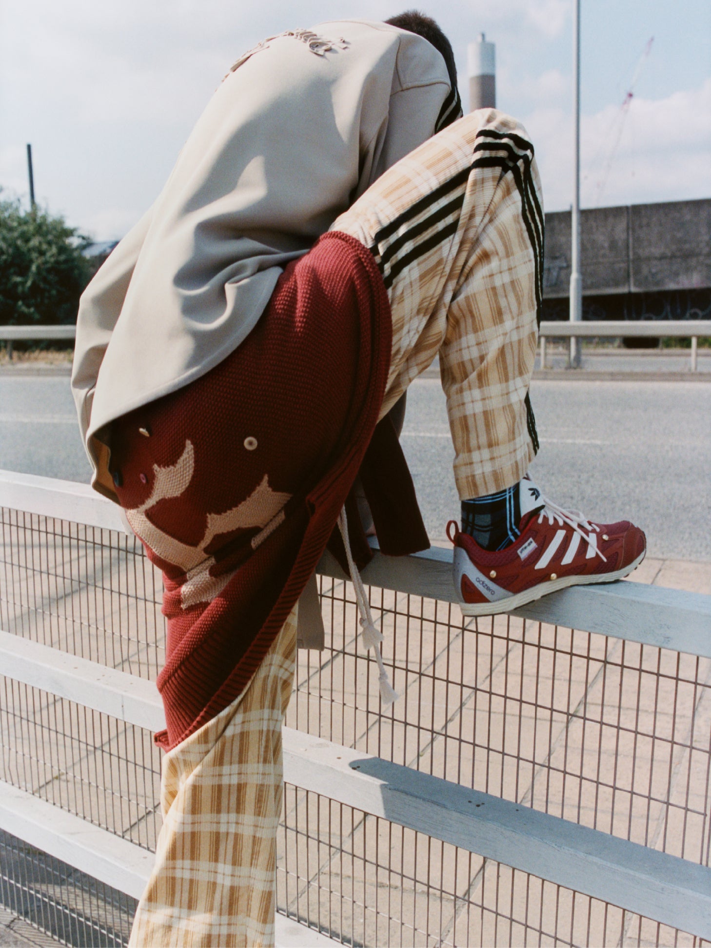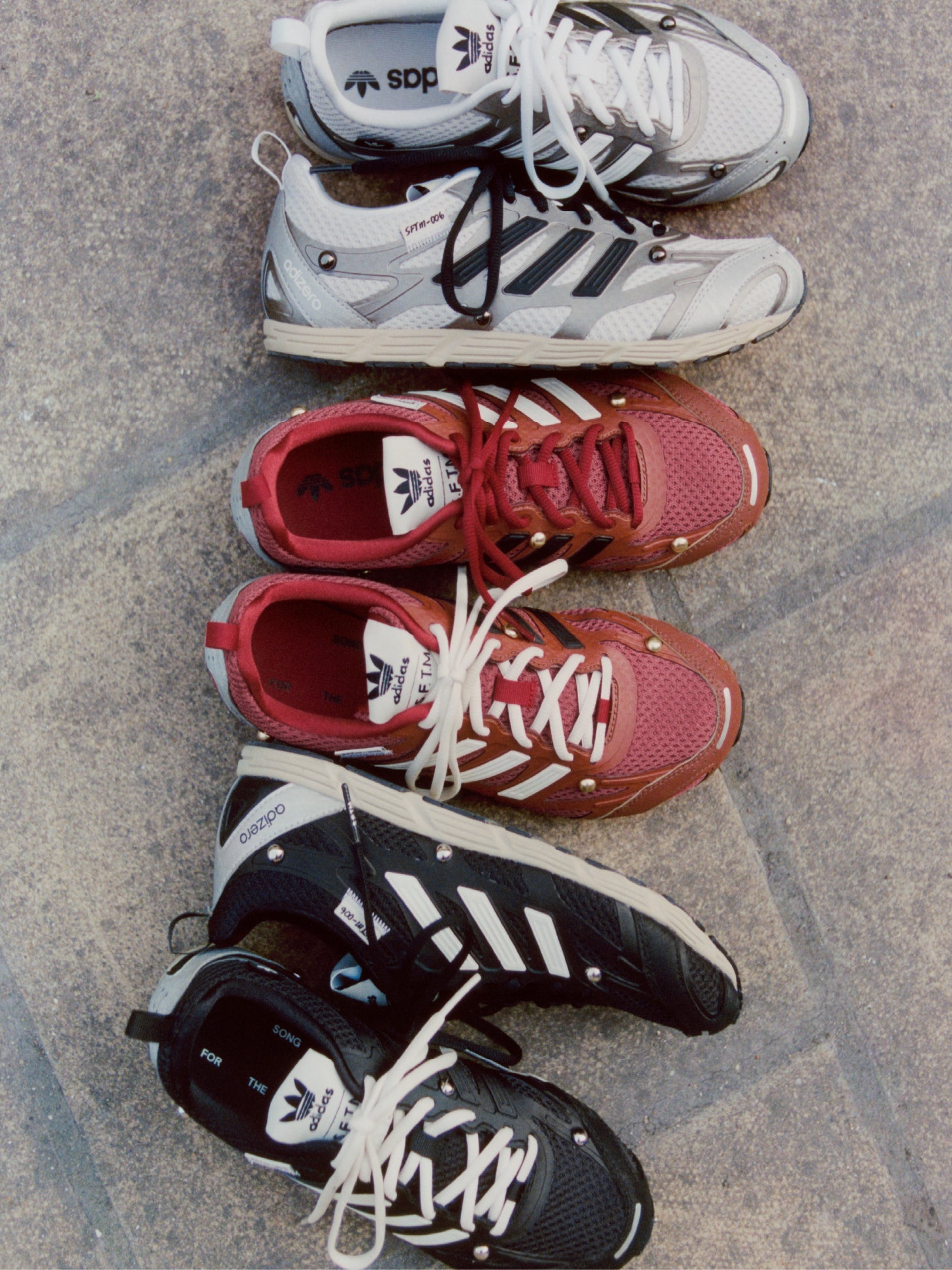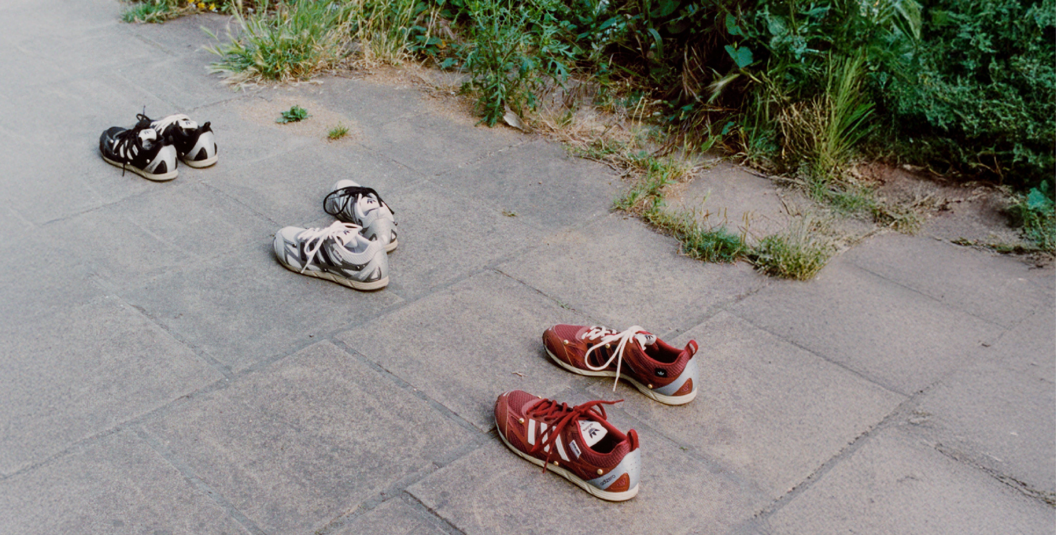 El Adizero, rescatado del archivo, adopta una nueva identidad a través de la fractura. Sus materiales —malla, TPU, caucho envejecido y detalles metálicos— crean una tensión entre lo deportivo y lo artesanal. Los cordones desiguales y las superposiciones plateadas introducen una disonancia calculada, mientras los matices entre el oxblood y el rojo deportivo evocan una memoria desdibujada del pasado.
