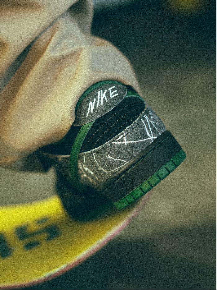 En esta oportunidad los SB Dunk Low, There Skateboards han optado por una estética sencilla y elegante. Los tenis cuentan con una parte superior negra, embellecida con aplicaciones de gamuza peluda gris oscura, que muestran caracteres garabateados en blanco, un sello distintivo de las tablas de skate de la firma.