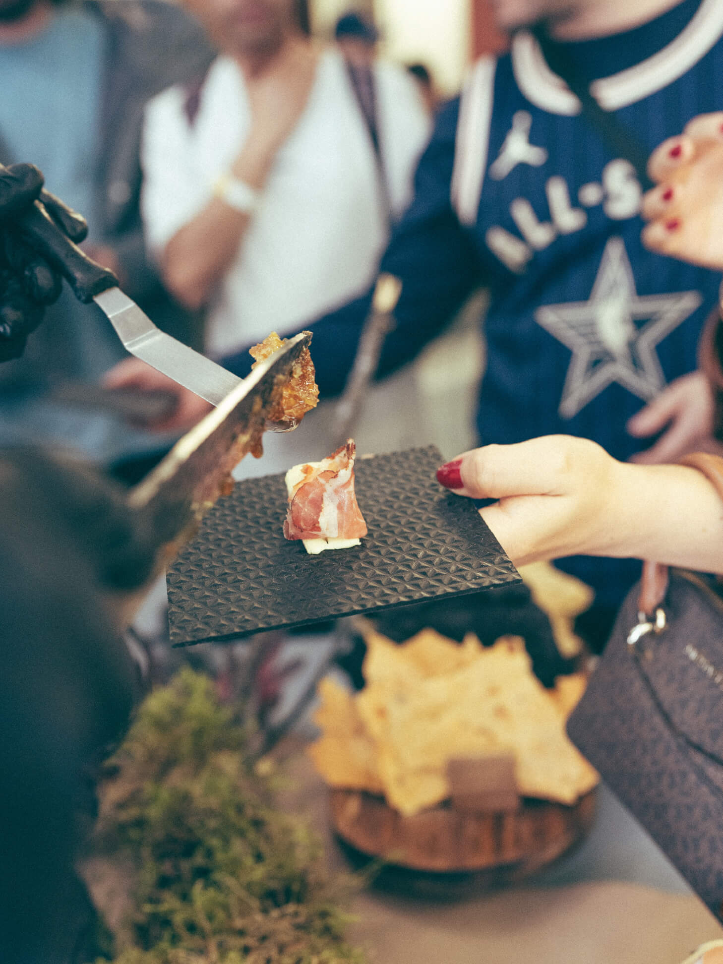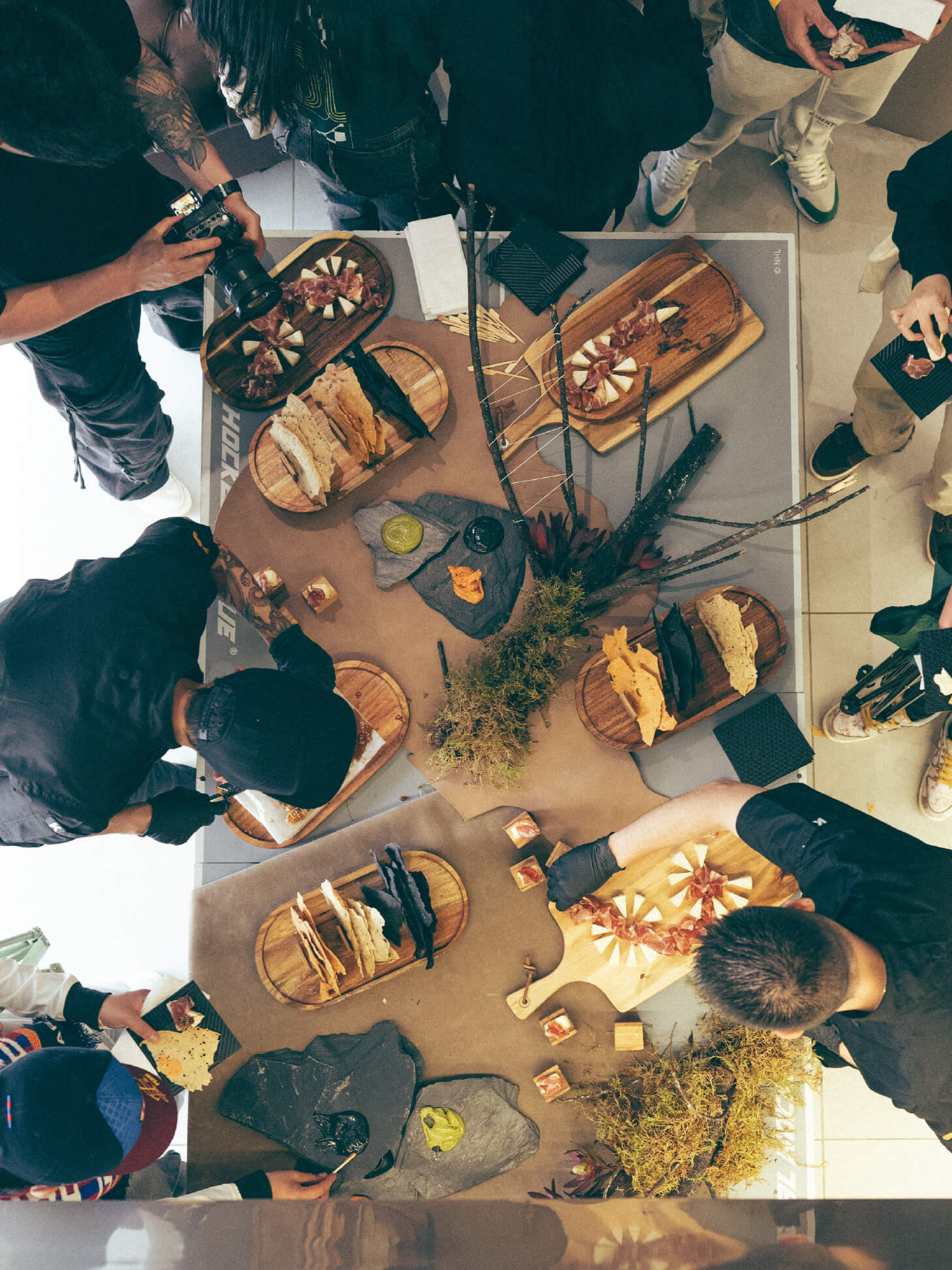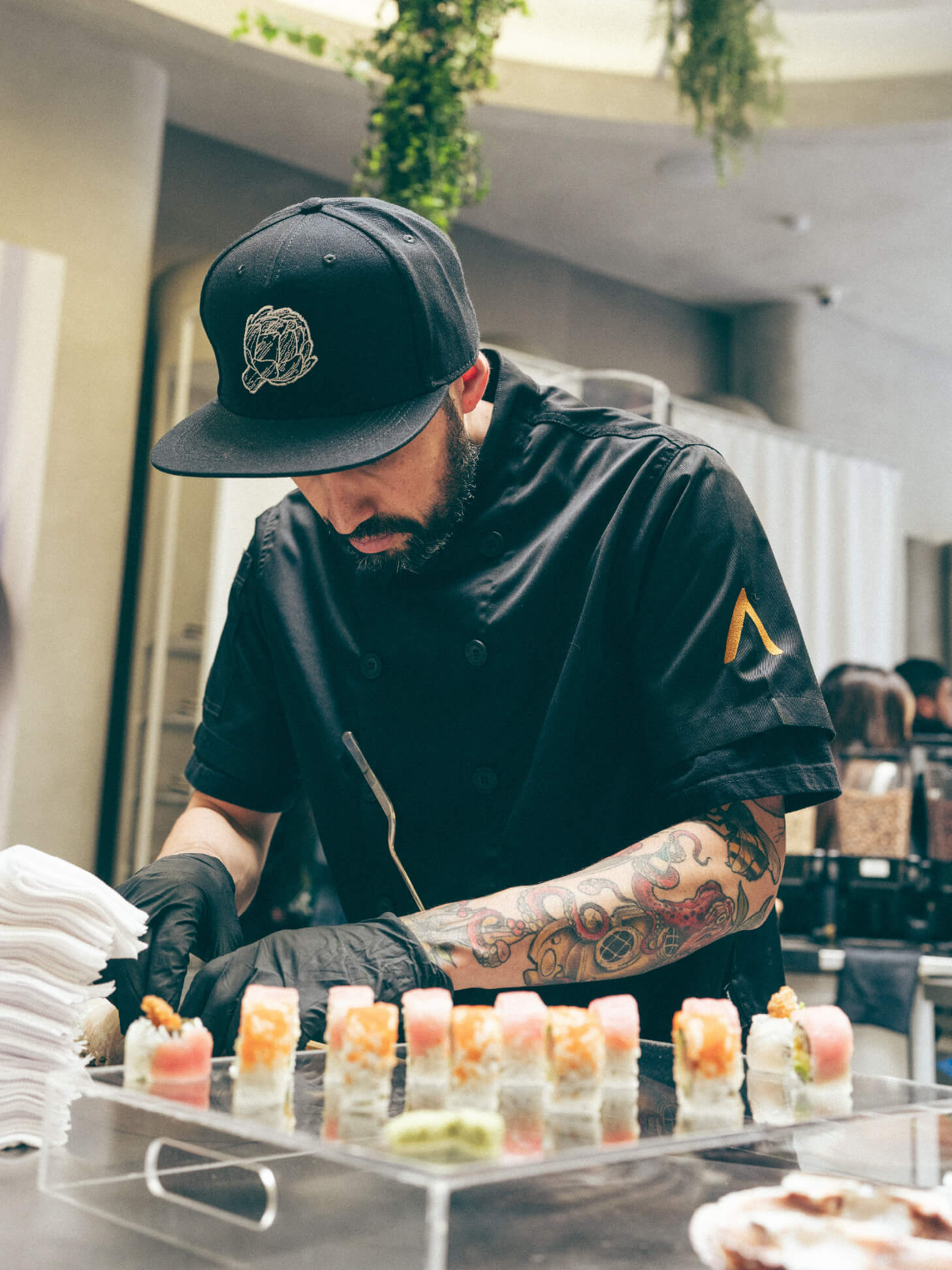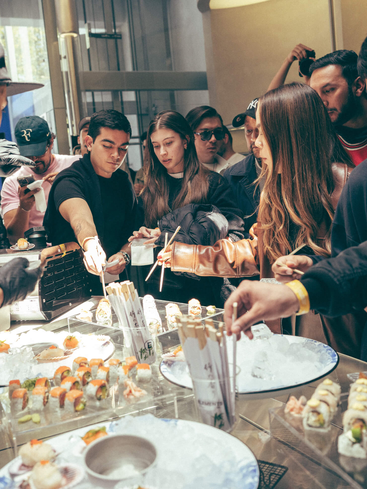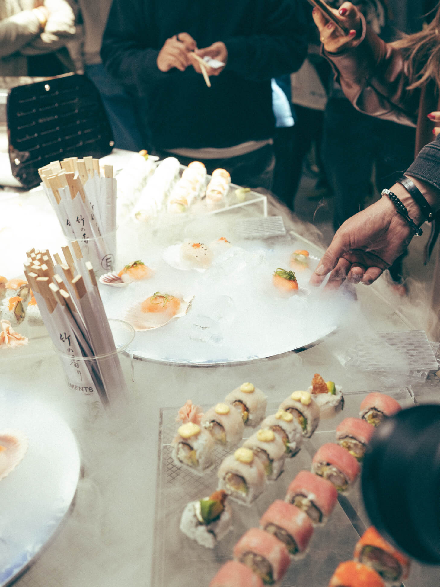 A medida que los asistentes ingresaban, la experiencia se expandía desde lo sensorial. Three Cities. Three Tables. tradujo la identidad cultural de cada ciudad al lenguaje gastronómico, convirtiendo cada piso de Broken Chains en una estación viva.La experiencia iniciaba en el tercer piso, trasladando a los asistentes a Tokio, con una barra de sushi en vivo liderada por nuestro chef invitado. El proceso, la precisión y la ejecución eran visibles: nigiris, rolls y sashimis preparados al momento, reforzando la idea de control, técnica y respeto por el producto, valores profundamente ligados a la visión de Fragment.