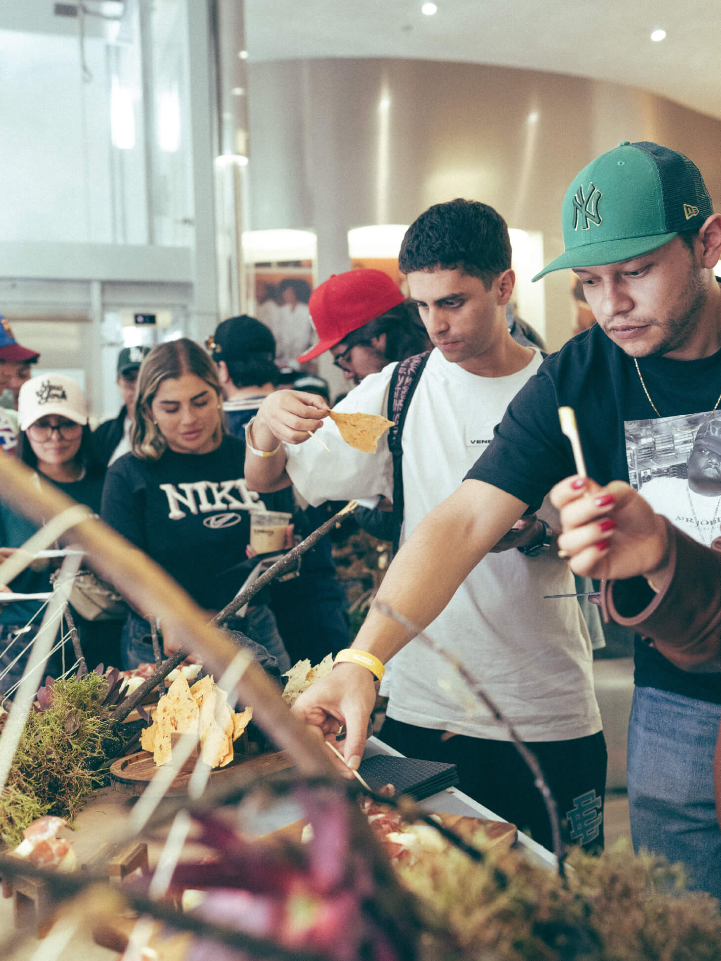 Antes de dar inicio oficial al lanzamiento, mientras la comunidad se formaba y recibía las manillas de acceso, la experiencia comenzó de manera orgánica. Baristas de nuestro coffee boutique Elements salieron a la fila para entregar café y mini croissants como un gesto simple pero intencional: acompañar la espera, generar conversación y crear un ambiente cercano y cálido.No se trataba solo de hacer más amable la fila, sino de establecer desde el primer momento que este lanzamiento no iba a vivirse desde la prisa, sino desde el cuidado, la hospitalidad y la comunidad. Ese gesto marcó el inicio real de la experiencia.