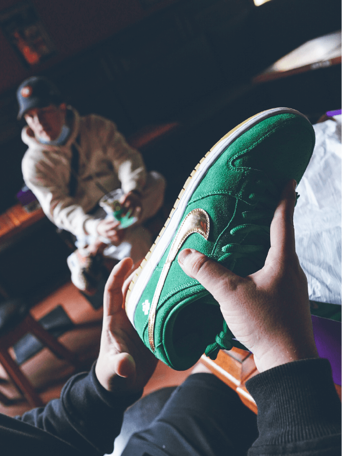 Para este evento, diseñamos una dinámica de venta única que llevó a nuestros clientes a una ubicación secreta. Allí, tuvieron la oportunidad de participar en un sorteo, donde los ganadores debían demostrar su pasión y conocimiento por los Nike Dunk SB al responder algunas preguntas para obtener acceso exclusivo a la compra. Para culminar la experiencia, se ofreció una bebida conceptualizada para celebrar elSt Patrick Day.