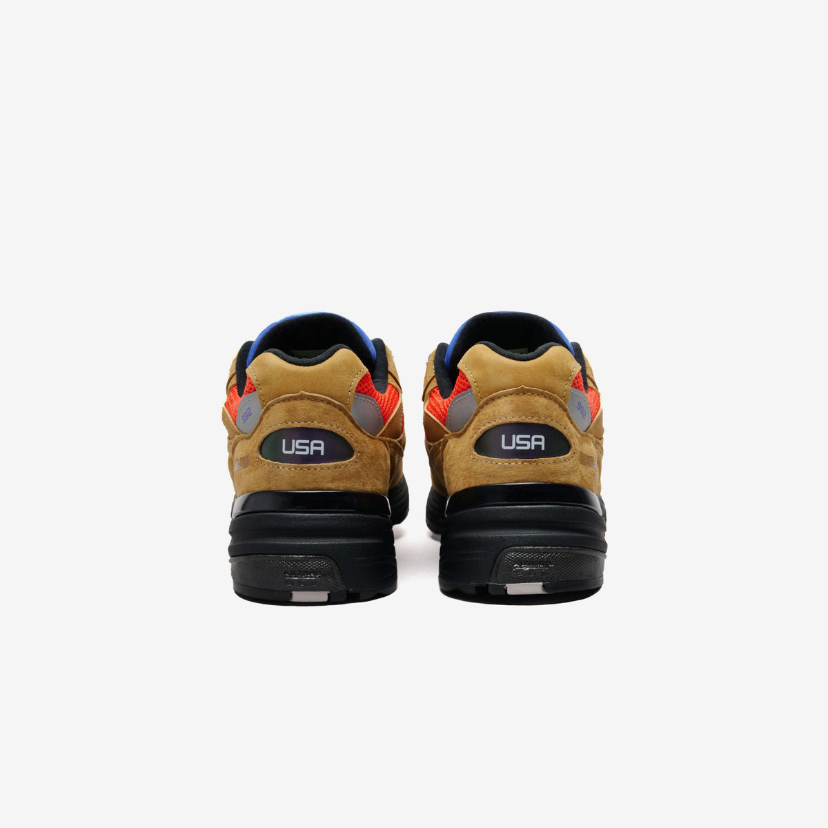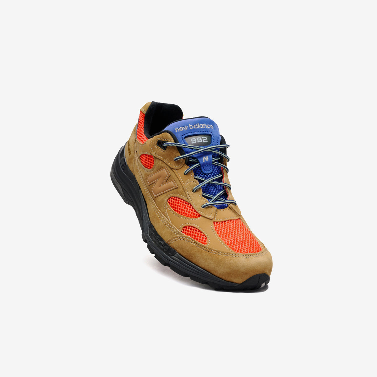 La interpretación de Action Bronson del modelo Made in USA 992 contrasta tonos neutros con colores vibrantes. En "Tiger Eye", Bronson combina ante marrón texturizado con toques de malla naranja llama. Estos tonos cálidos se ven realzados por la lengüeta azul cobalto y la suela exterior negra ahumada. Detalles intrincados como el logotipo "BAKLAVA" estampado y los cordones a rayas evocan elementos característicos del estilo de Action.