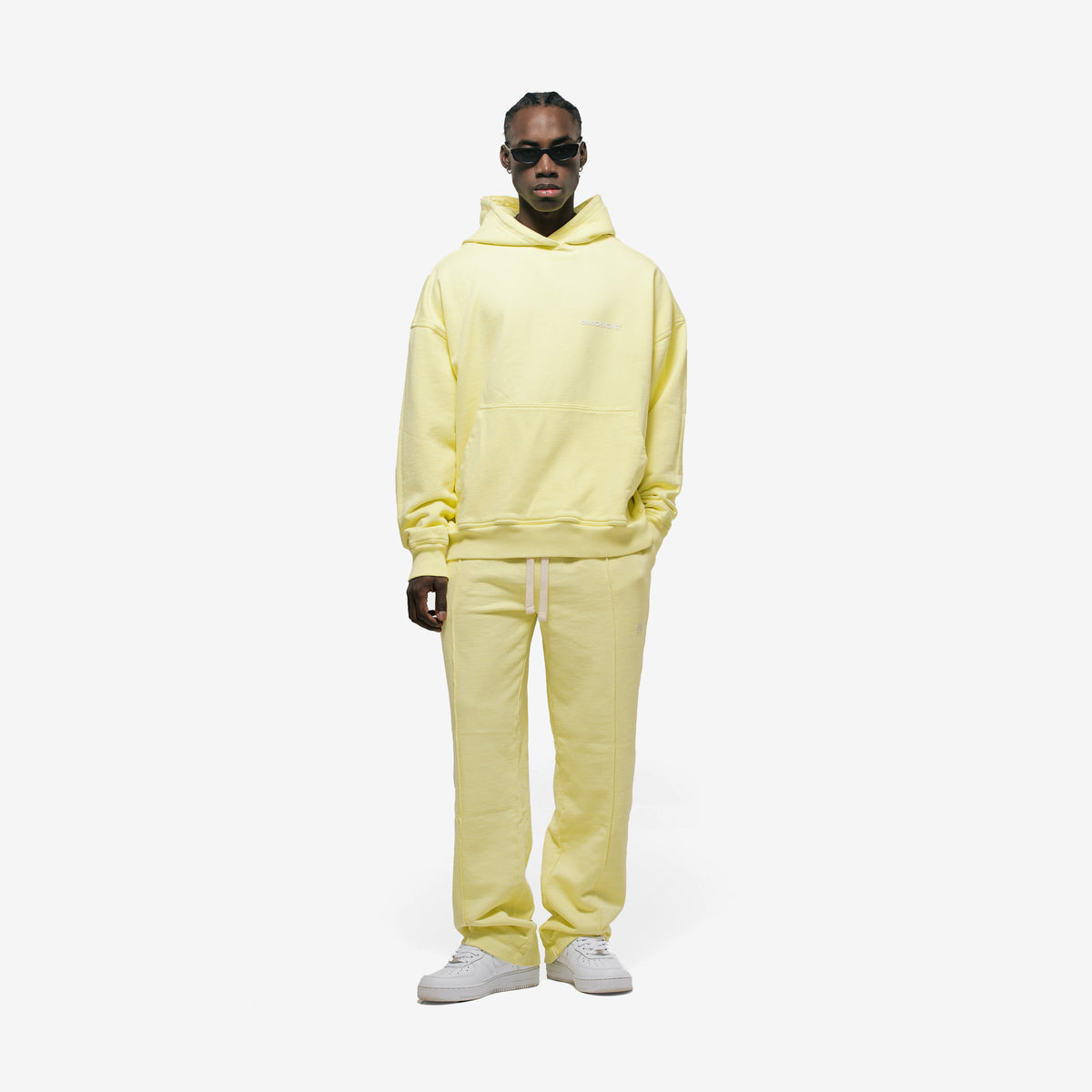 Hoodie Oversized Básico V3 color Amarillo, confeccionado en 100% algodón de alto gramaje (400 gsm). Pre-encogido y teñido en prenda para máxima calidad y terminación. Incluye capota, bolsillo tipo canguro, puños y cintura en rib, y logo “Monoic” en serigrafía de alto relieve (puff 3D) en el pectoral izquierdo.