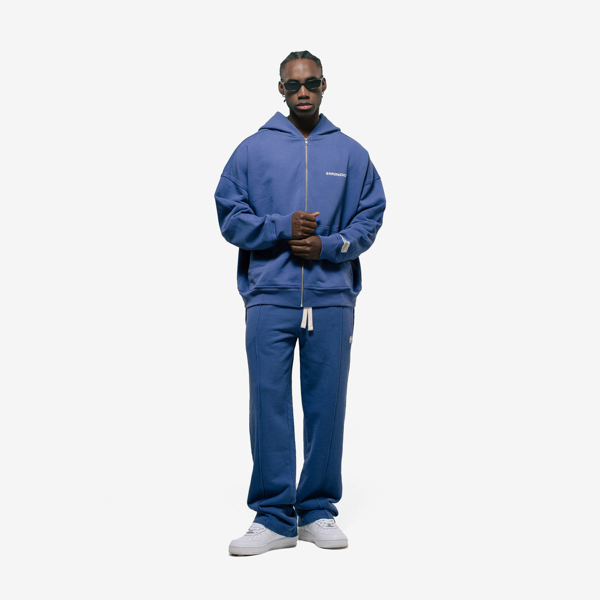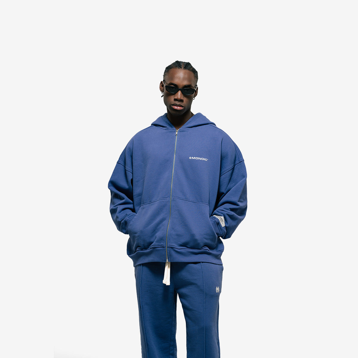 Zip Hoodie Oversized Básico V3 color Lavanda (Skipper Blue), 100% algodón (400 gsm). Pre-encogido y teñido en prenda. Cremallera frontal YKK #5, bolsillos laterales, capota y rib en puños/cintura. Logo “Monoic” en serigrafía en el pectoral izquierdo.