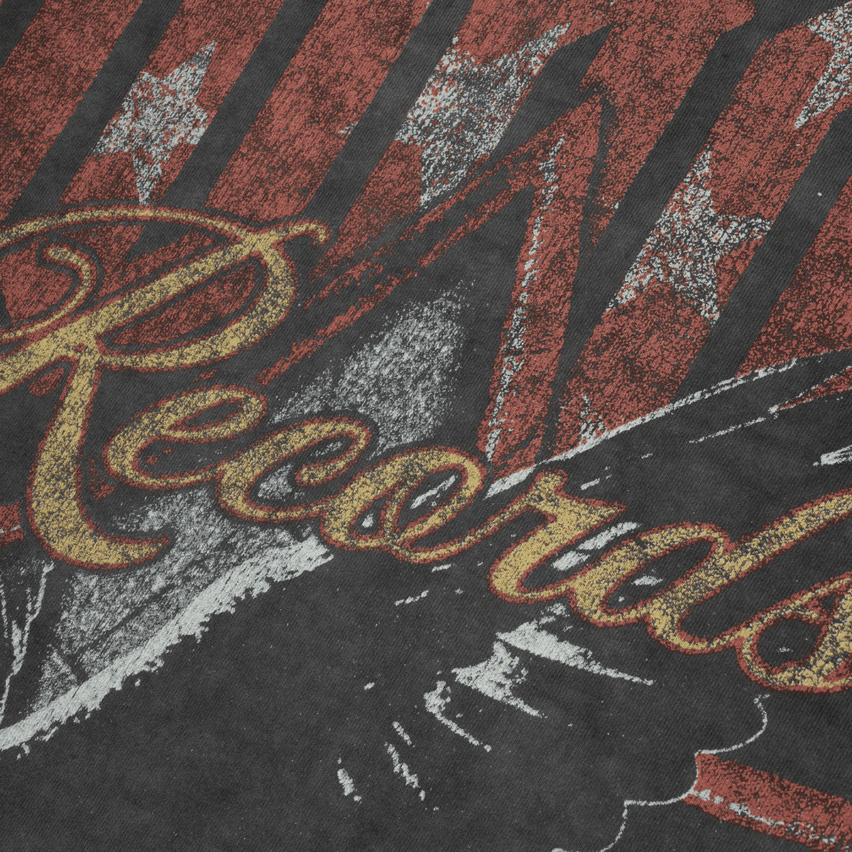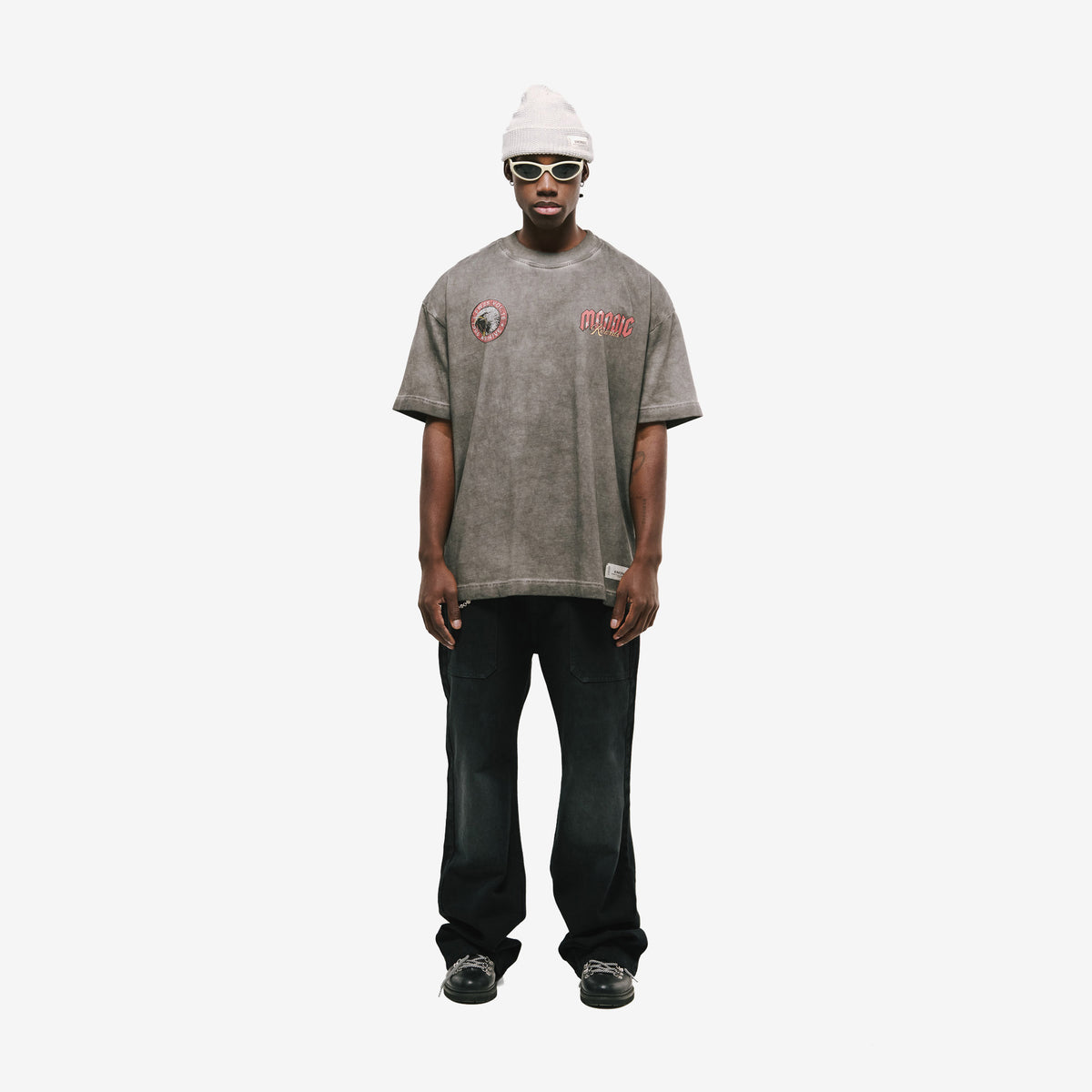 Camiseta con fit oversized en gris desgastado, confeccionada en 100% algodón de alto gramaje (250 gsm). El color se logra en tintorería para un look vintage inspirado en las camisetas de rock de los 80s y 90s. Gráficos en serigrafía sin tacto: arte “Eagle” a toda la espalda con desgastes y prints en ambos pectorales. Marquilla MONOIC en la cintura del lado izquierdo.