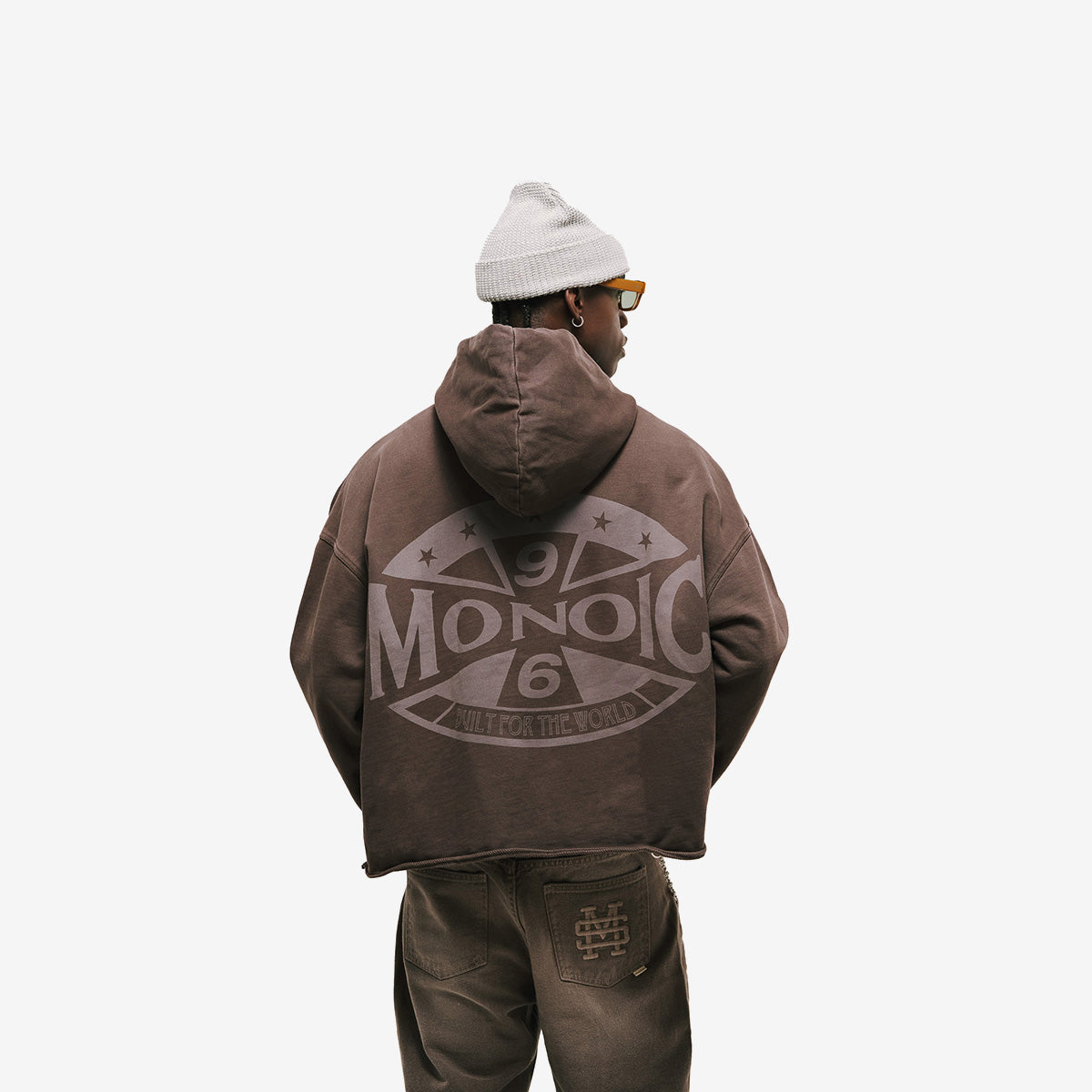 Hoodie en algodón 100% de alto gramaje (410 gsm), color café desgastado para un look vintage. Gráficos: serigrafía de alto relieve en el pectoral izquierdo y arte “Compass” en la espalda con serigrafía sin tacto (tipo corrosión, acabado suave, sin relieve). Puños y cintura cortados manualmente para un toque rockero. Fit oversized, holgado. Marquilla MONOIC en la manga izquierda.
