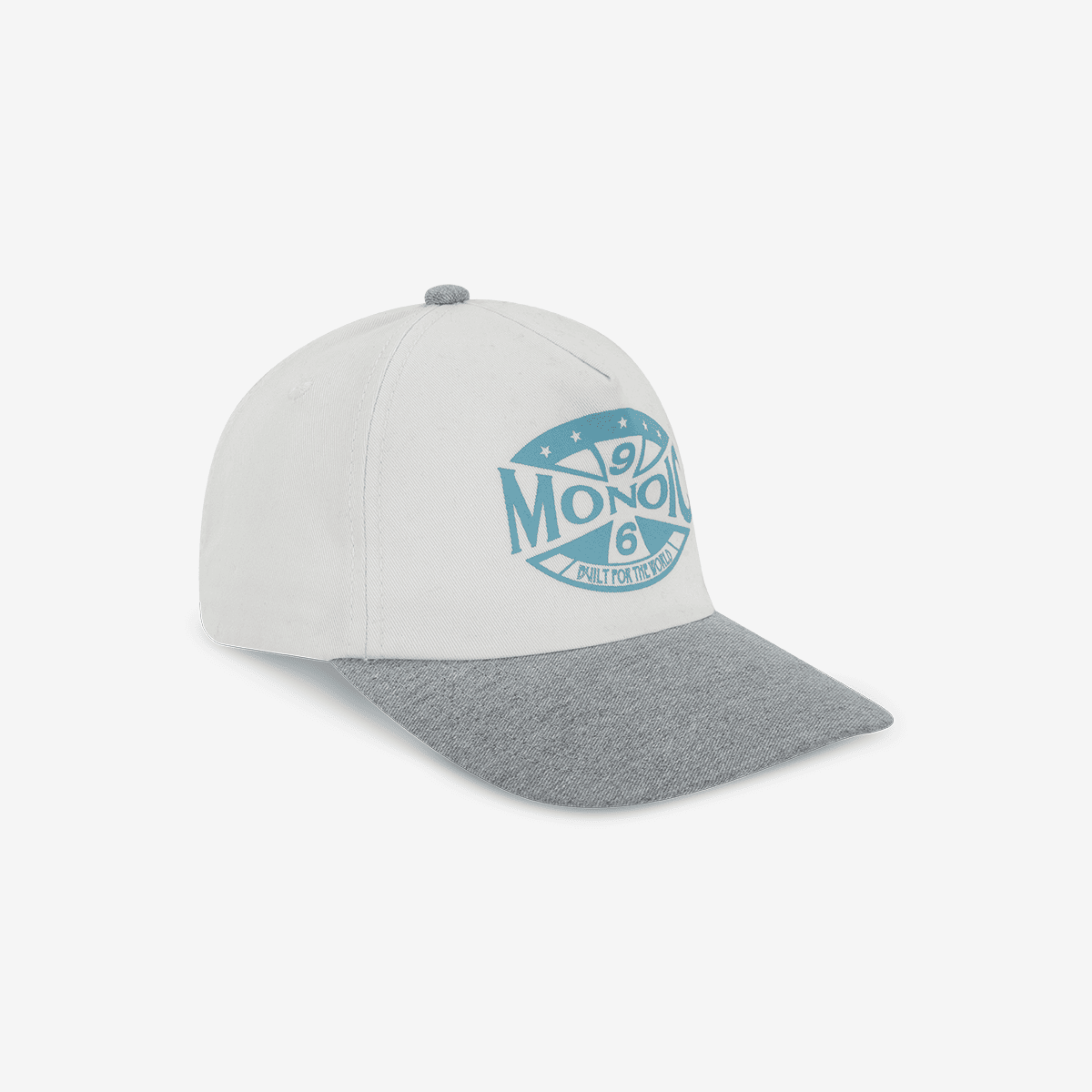 Gorra 5 paneles SIN estructura (tendencia), color blanco hueso con gráfico “Compass” en el panel frontal en serigrafía sin tacto (no-feel) color azul claro. Monograma bordado en el lado izquierdo, insumos personalizados en el interior y banderín MONOIC en la solapa trasera. Talla única ajustable.