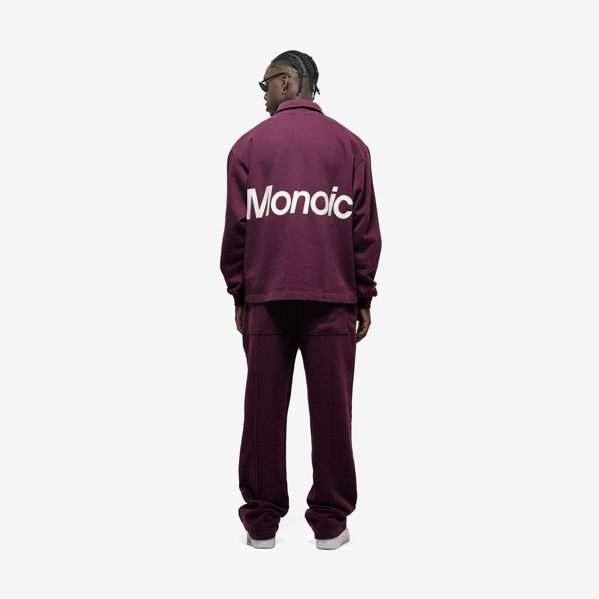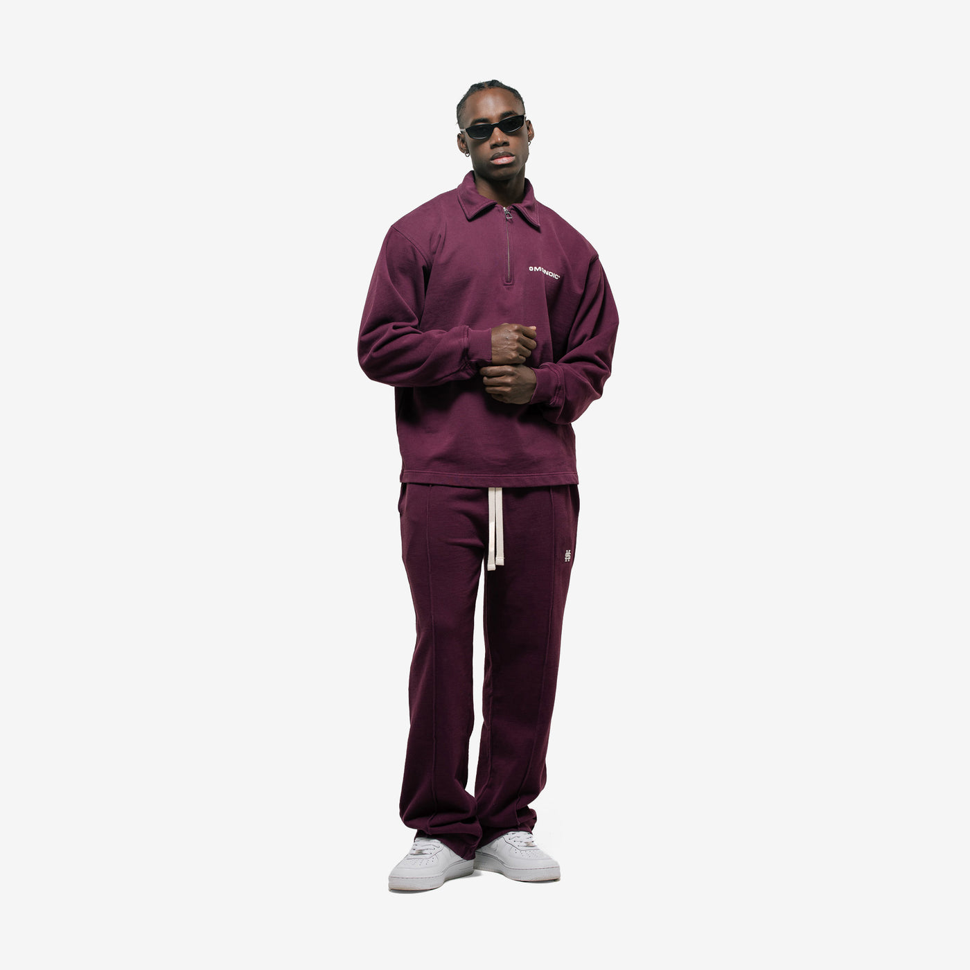 Quarter Zip V3 Oversized en color Burgundy, confeccionado en burda sin perchar de 100% algodón (410 gsm). Silueta con oversized fit, cuello alto con cierre a un cuarto, puños en rib y acabado premium. En la espalda, estampado “Monoic” en serigrafía de alto relieve para un look definido y elegante.