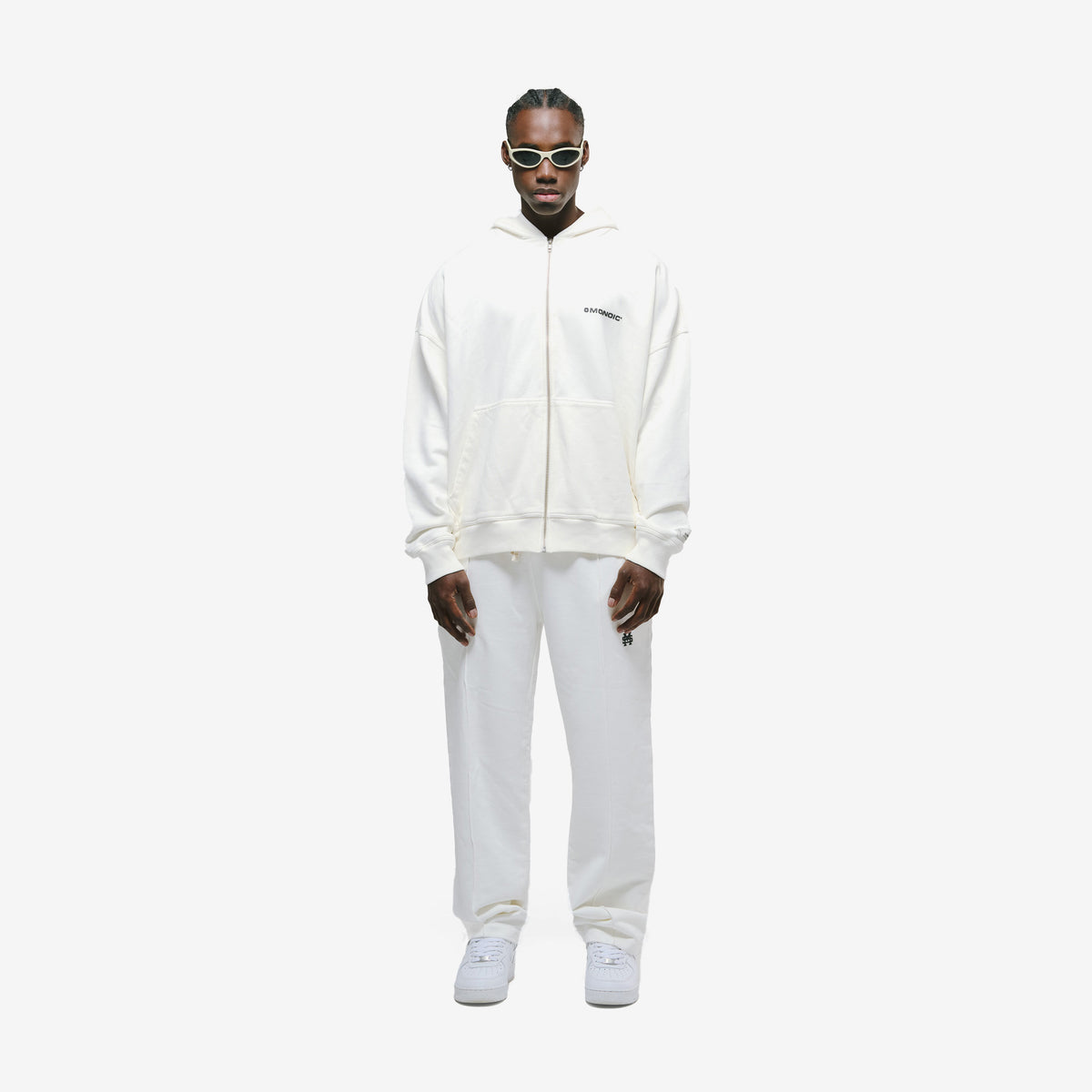 Zip Hoodie Oversized Básico V3 color Off White (Egret), en 100% algodón de 400 gsm. Pre-encogido y teñido en prenda. Cremallera frontal YKK #5, bolsillos laterales, capota y rib en puños y cintura. Logo “Monoic” en serigrafía en el pectoral izquierdo.