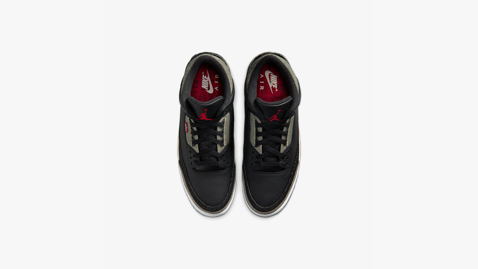 Jordan y Levi’s® vuelven a unirse para ofrecer una nueva versión de los AJ3. El denim negro invertido y el cuero premium mate en la parte superior crean un elegante look oscuro con efecto lavado. La icónica etiqueta roja en los ojales hace juego con los detalles en rojo gimnasio de la suela y la plantilla, a la vez que el distintivo gráfico de billete de dólar de Levi’s® completa el look.