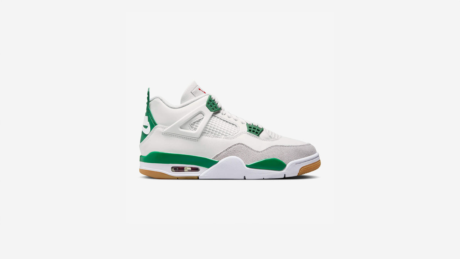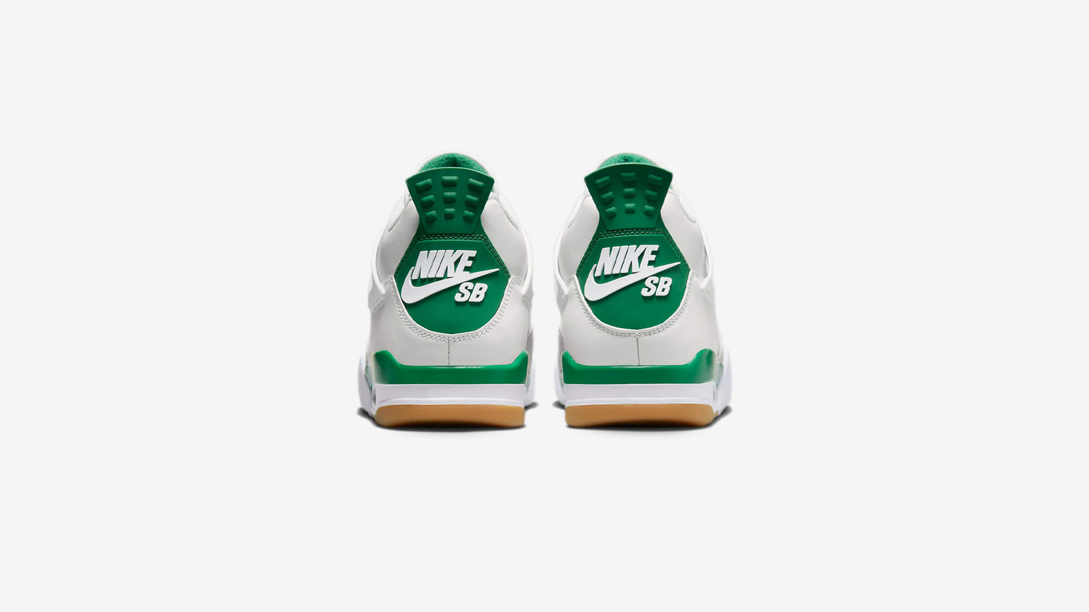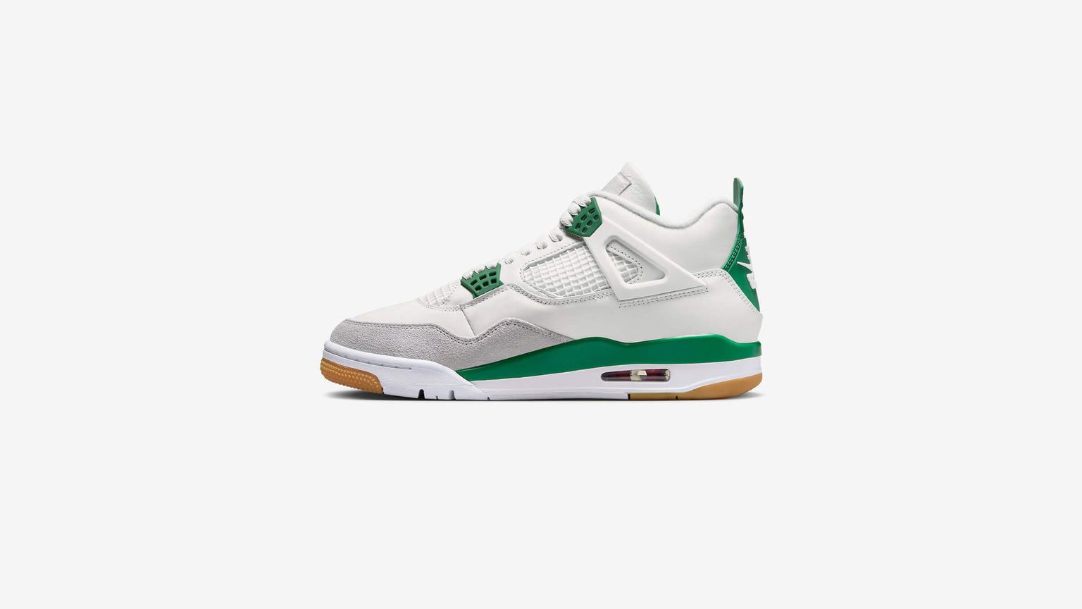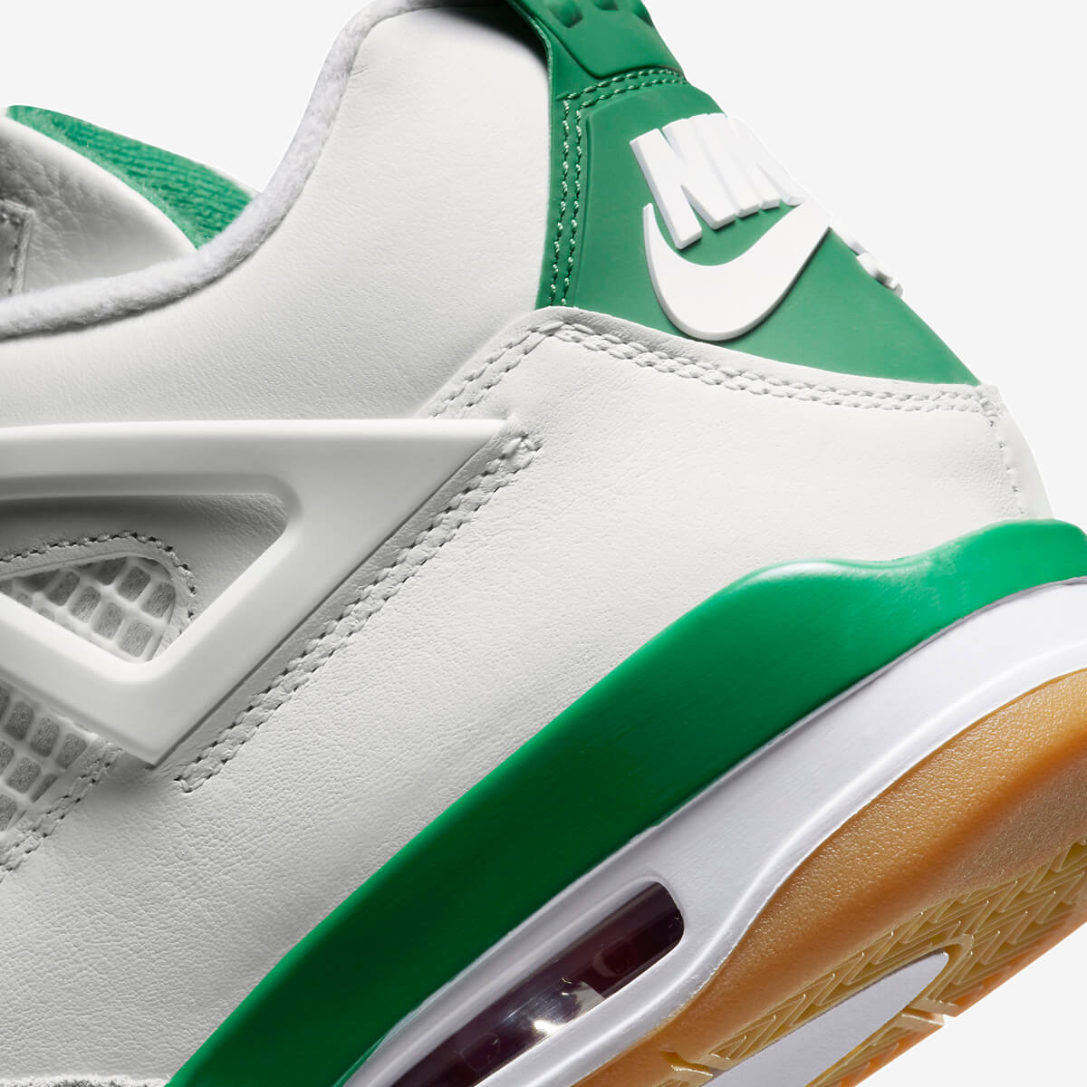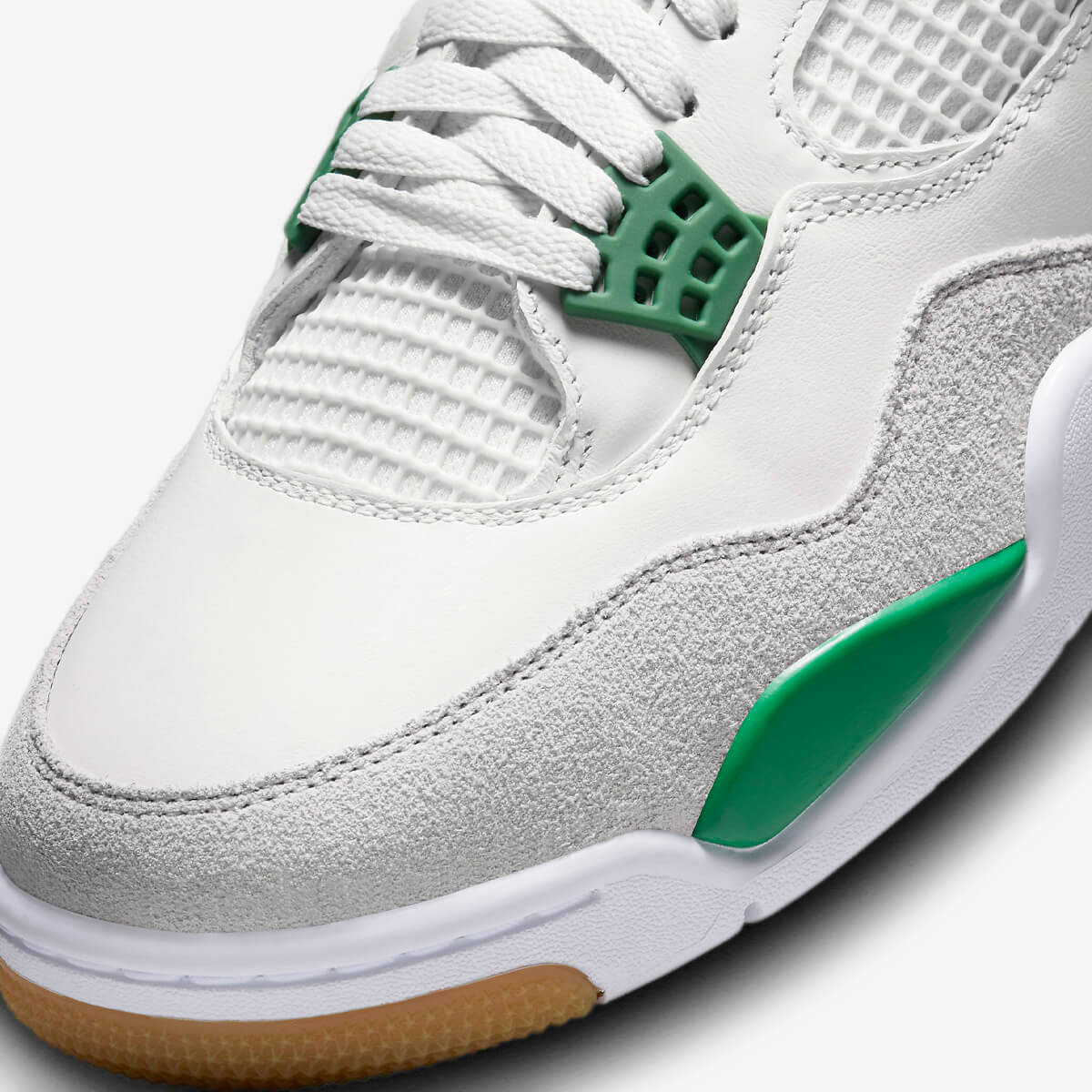 El Nike SB x AJ4 celebra uno de los mejores duos del mundo del calzado: el difunto Sandy Bodecker (por algo se llama Nike SB) y el diseñador legendario Tinker Hatfield. Juntos crearon el ícono esta versión de las Air Jordan 4 presenta una parte superior de cuero blanco con capas de gamuza gris neutro y acentos contrastantes en verde pino en los ojales y la entresuela. "Nike SB" reemplazando a "Nike Air/Jumpman" en los talones con la marca de la lengüeta en rojo sobre una entresuela blanca y una suela exterior de goma Gum que completa el diseño. También se incluye marca compartida y empaque especial.