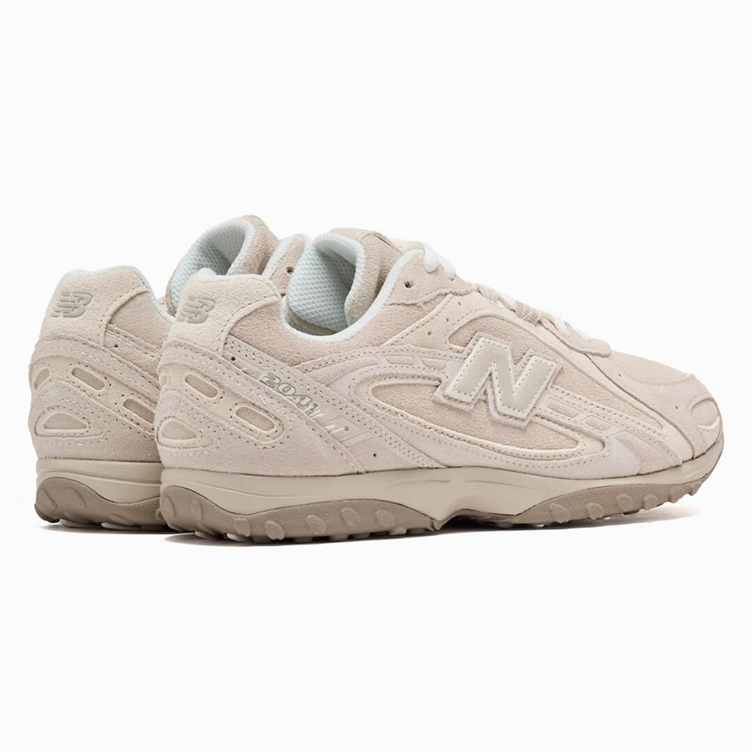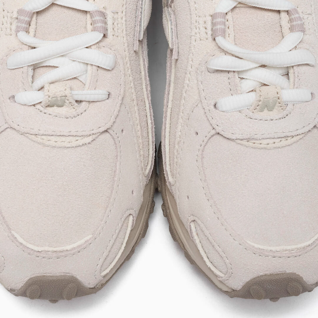 La parte superior presenta una paleta discreta de Timberwolf, confeccionada en ante premium con superposiciones en relieve y sutiles detalles serigrafiados a lo largo del sillín. El logotipo "N" doble apilado, característico de New Balance, añade profundidad al lateral, mientras que las superposiciones arqueadas aportan movimiento a la silueta.