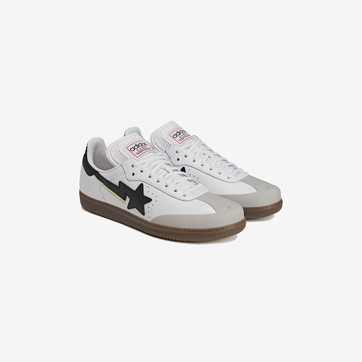 .Etiqueta dorada de A BATHING APE en el lateral y la marca compartida en la lengüeta acanalada