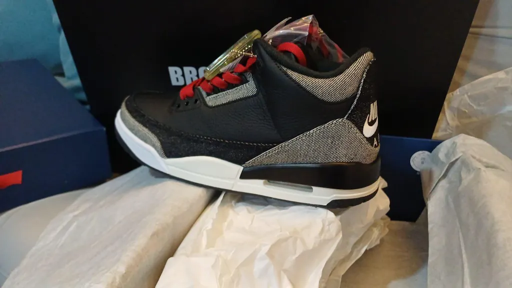 Jordan y Levi’s® vuelven a unirse para ofrecer una nueva versión de los AJ3. El denim negro invertido y el cuero premium mate en la parte superior crean un elegante look oscuro con efecto lavado. La icónica etiqueta roja en los ojales hace juego con los detalles en rojo gimnasio de la suela y la plantilla, a la vez que el distintivo gráfico de billete de dólar de Levi’s® completa el look.