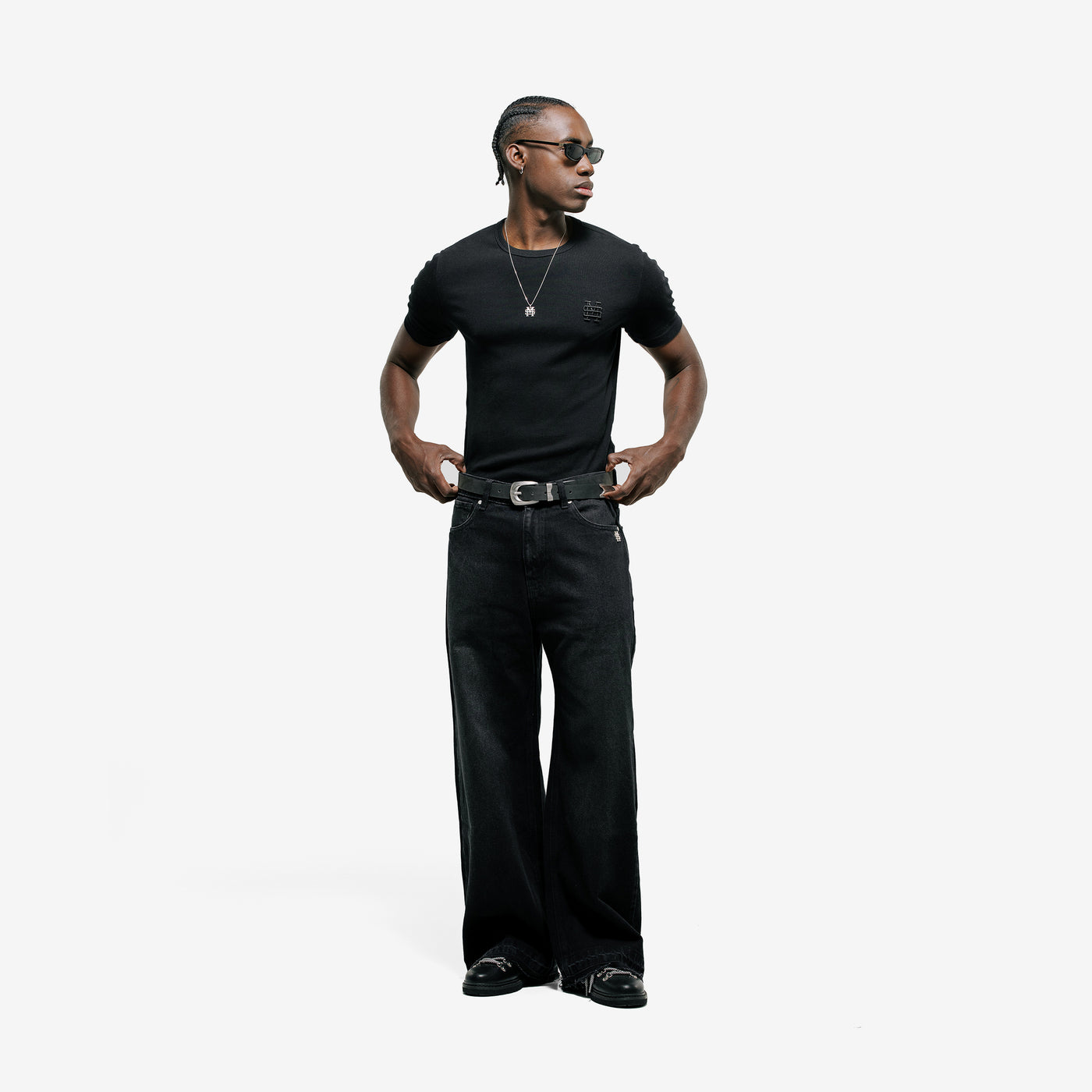 Camiseta Muscle Fit color Negro Oscuro, confeccionada en Rib de 100% algodón. Diseñada con un ajuste ceñido al cuerpo que resalta la silueta, cuello redondo en rib y monograma bordado en el pectoral izquierdo en tono negro. Incluye marquilla tejida MONOIC en el lateral izquierdo.