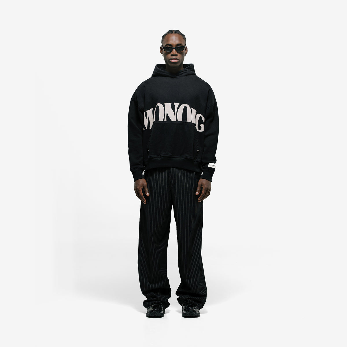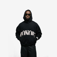 Hoodie Oversized color Negro Oscuro, confeccionado en 100% algodón. En la espalda presenta un estampado en serigrafía que combina alto relieve con acabado sin tacto, logrando textura y definición sin perder suavidad. Incluye bolsillo tipo canguro frontal con remaches metálicos y marquilla MONOIC en la manga izquierda.