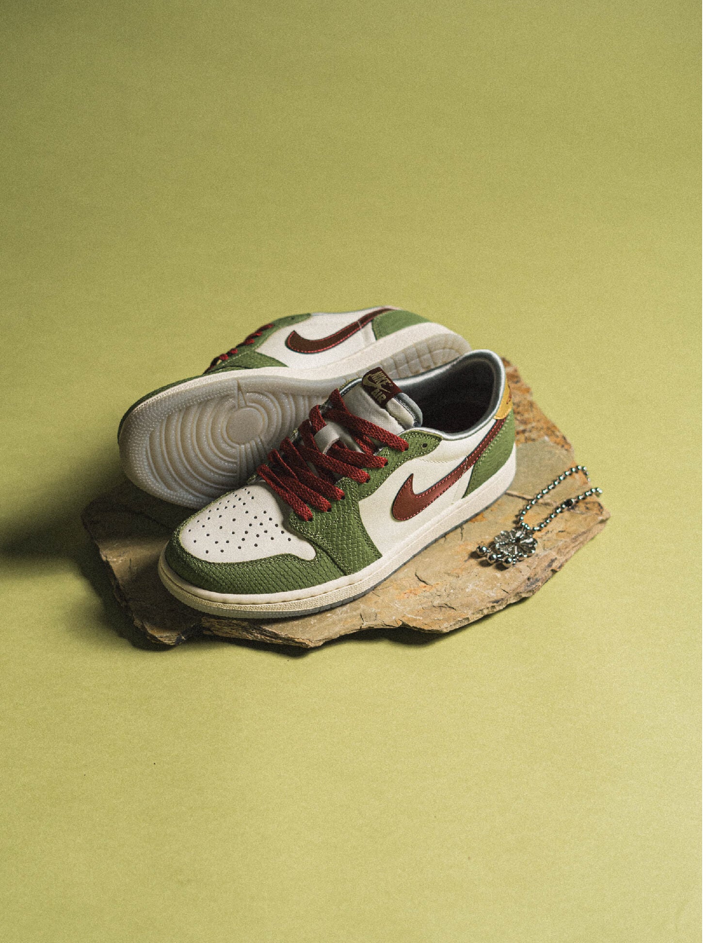 Este par de sneakers comienzan su construcción de estilo sobre una base de cuero premium "Sail" de color blanco que se contrasta por unos paneles de escamas en cuero verde “Oil Green”como detalle protagonista y que se extienden desde el talón hasta la punta.
